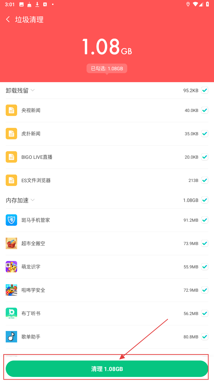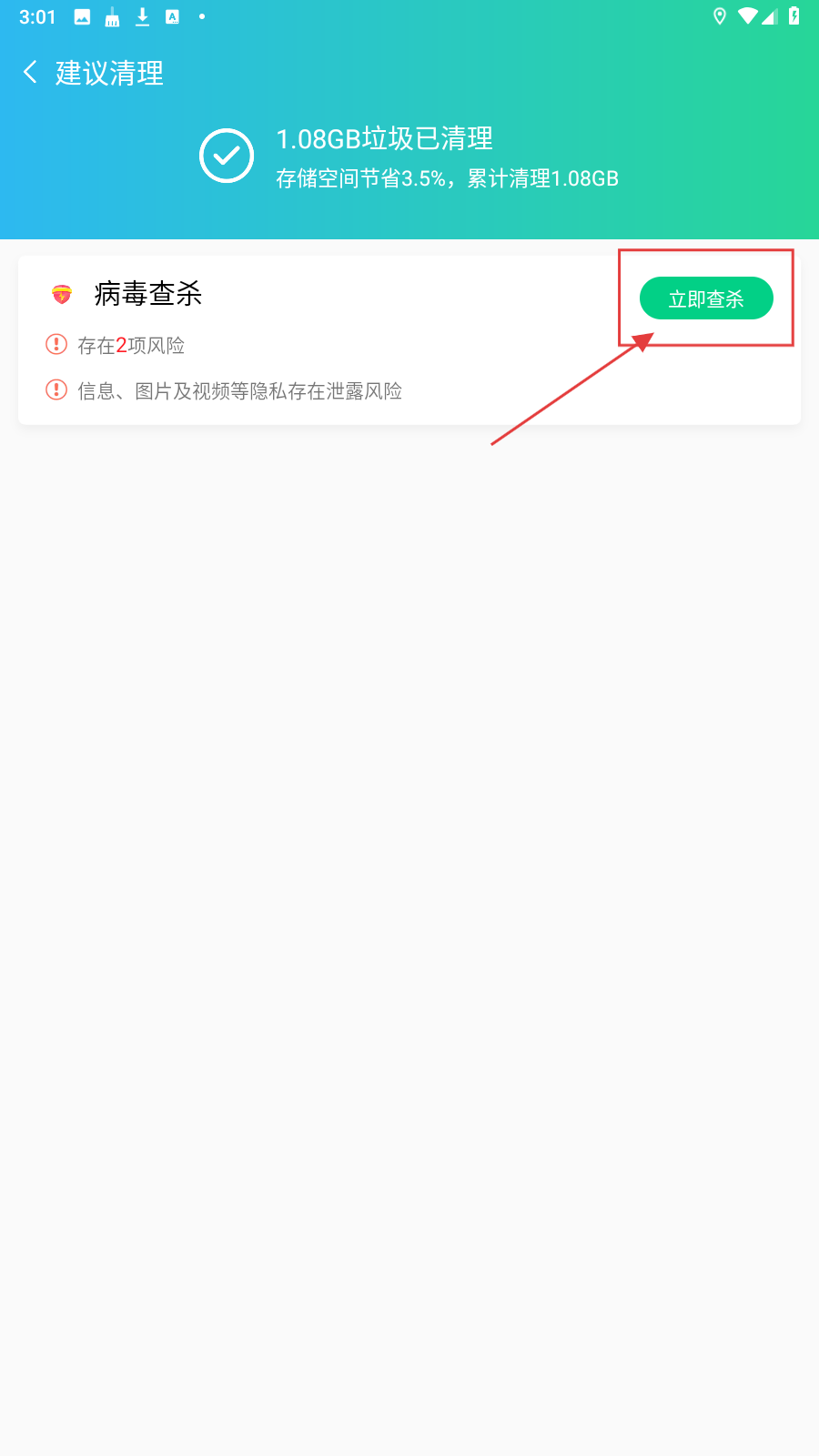 2、在垃圾清理页面,点击【清理1.08GB】按钮,进行垃圾清理操作,释放手机存储空间。