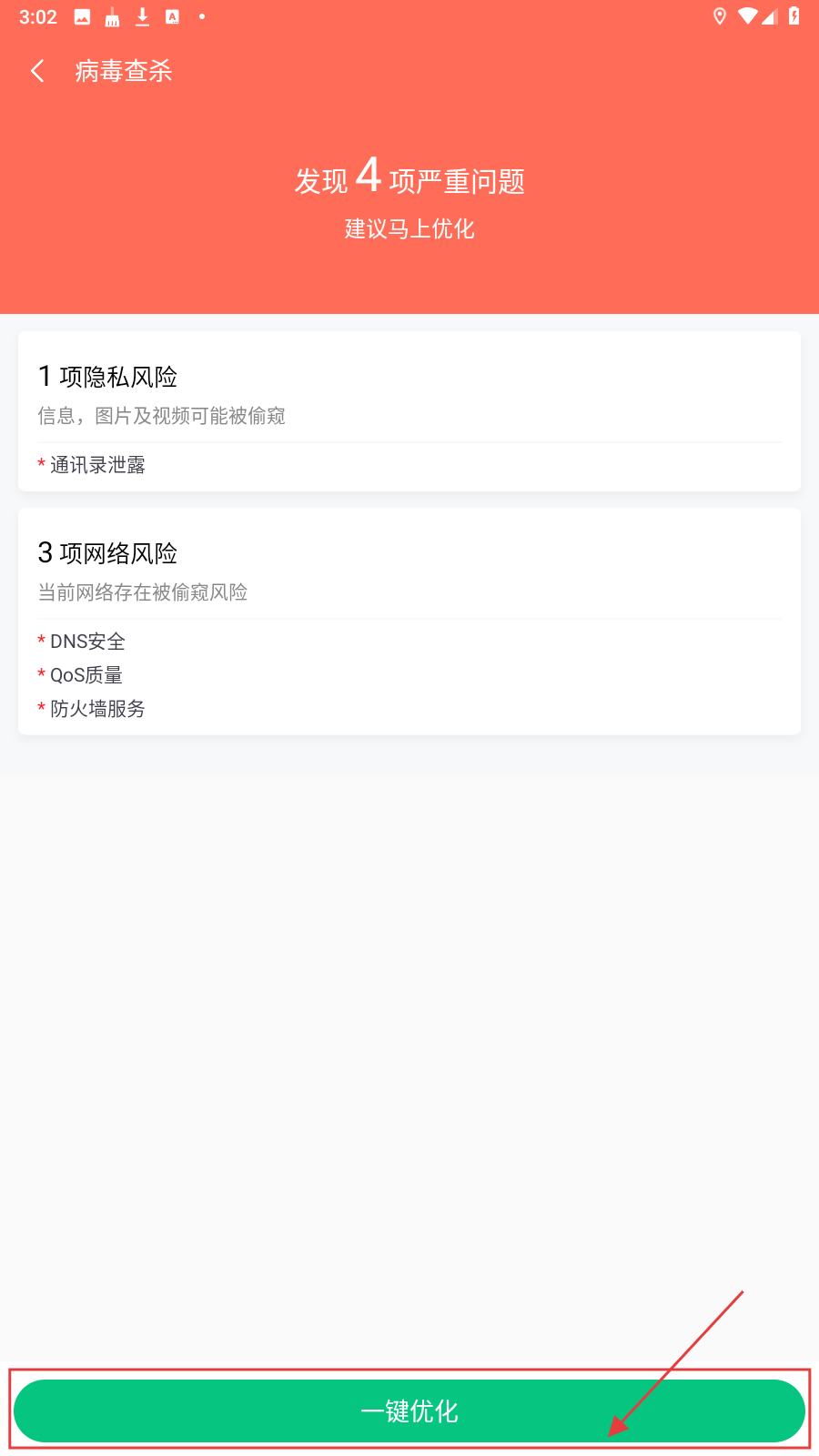 4、在病毒查杀页面,点击【一键优化】按钮,进行系统优化操作,修复手机安全问题。
