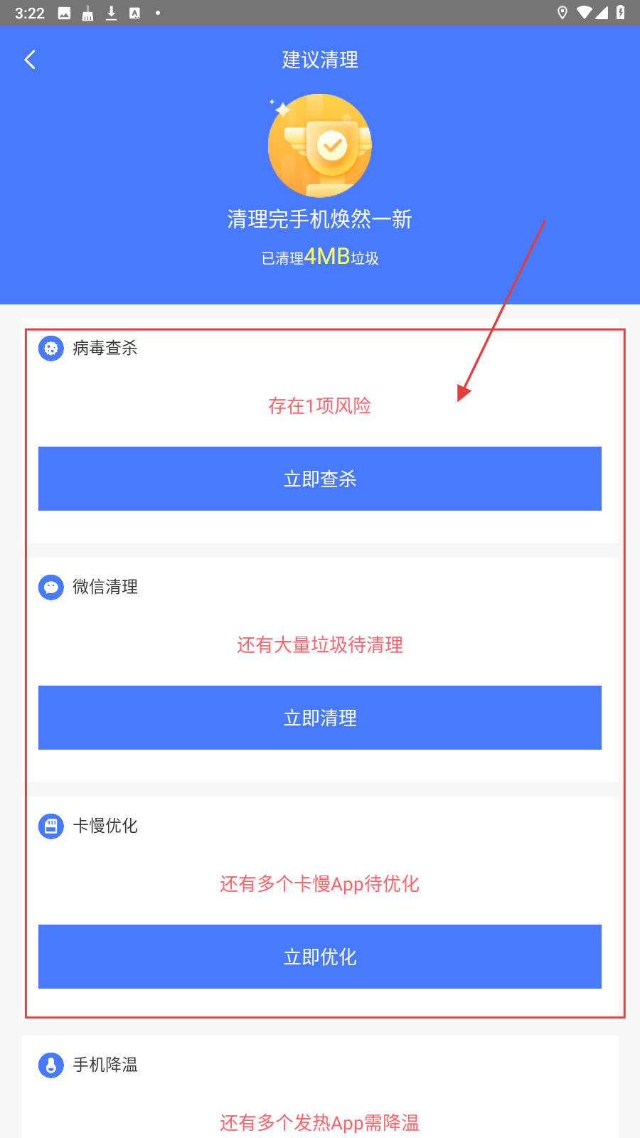 1、在首页点击【立即清理】按钮,进入建议清理页面,查看手机优化建议。