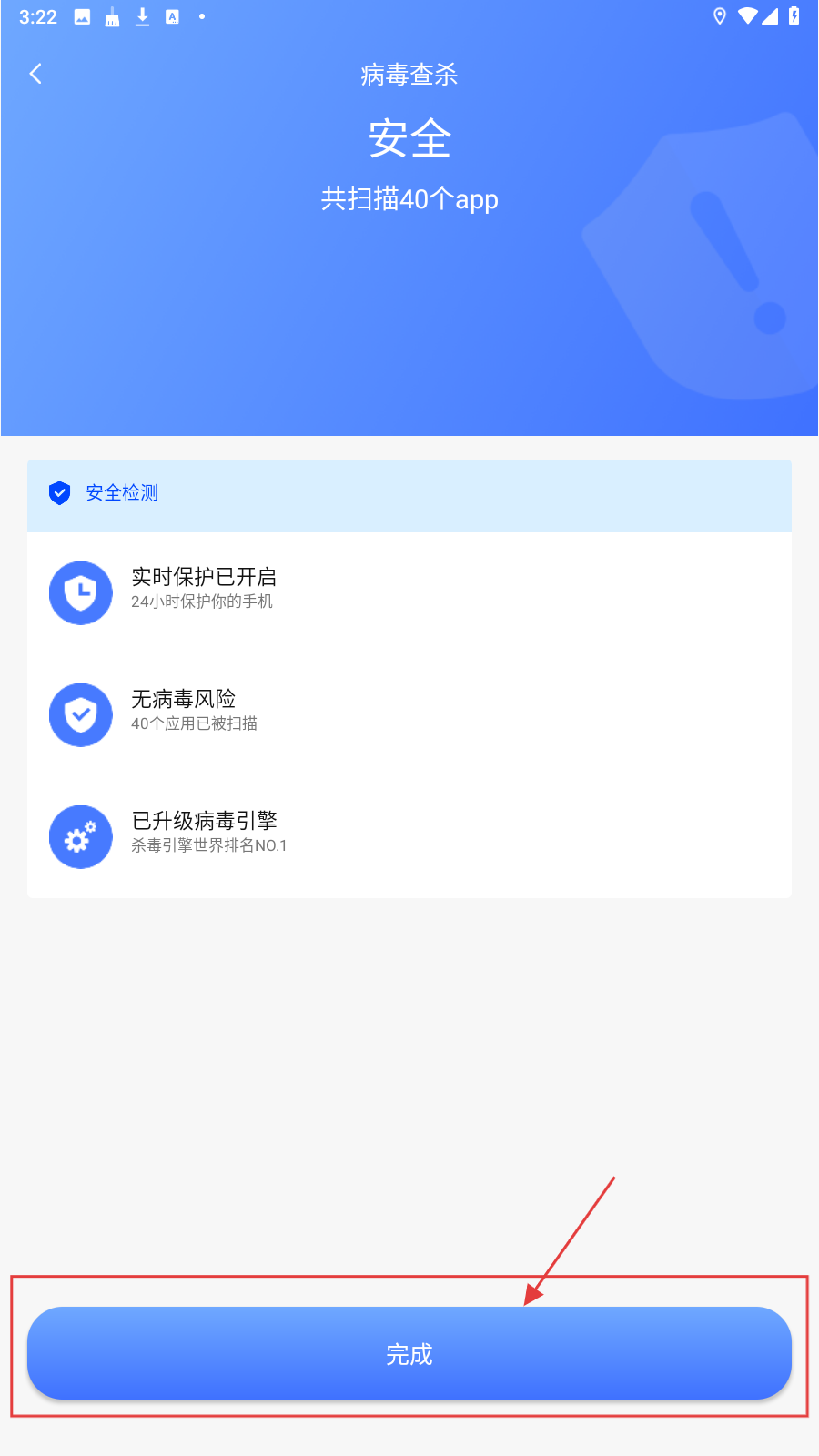 3、在病毒查杀页面,点击【完成】按钮,结束安全检测,返回建议清理页面。