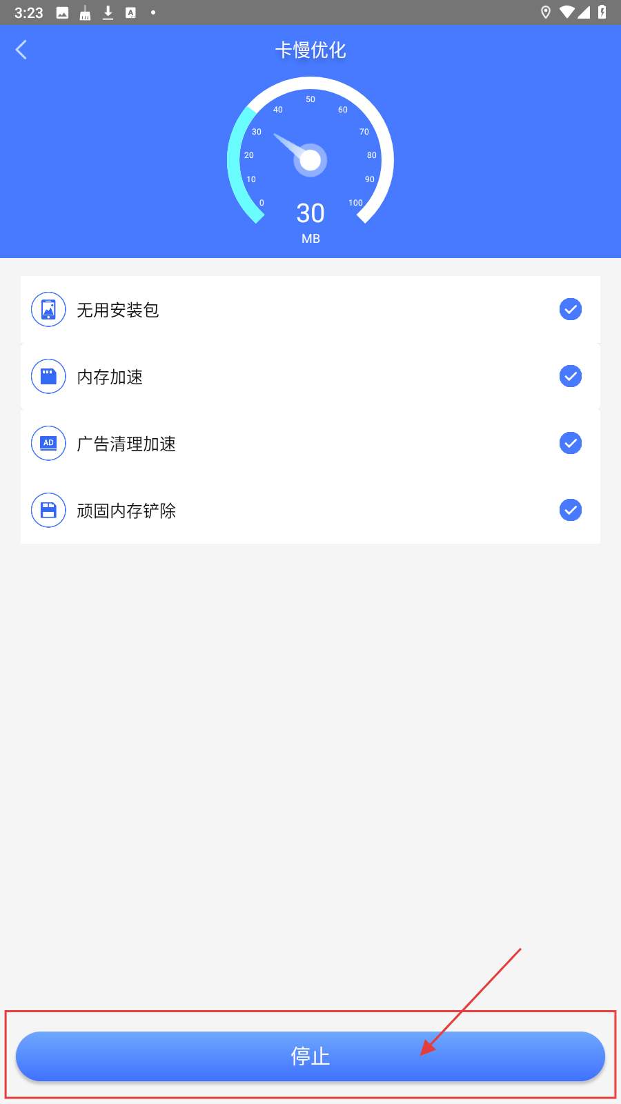 4、在卡慢优化页面,点击【停止】按钮,结束卡慢优化操作,完成手机优化。