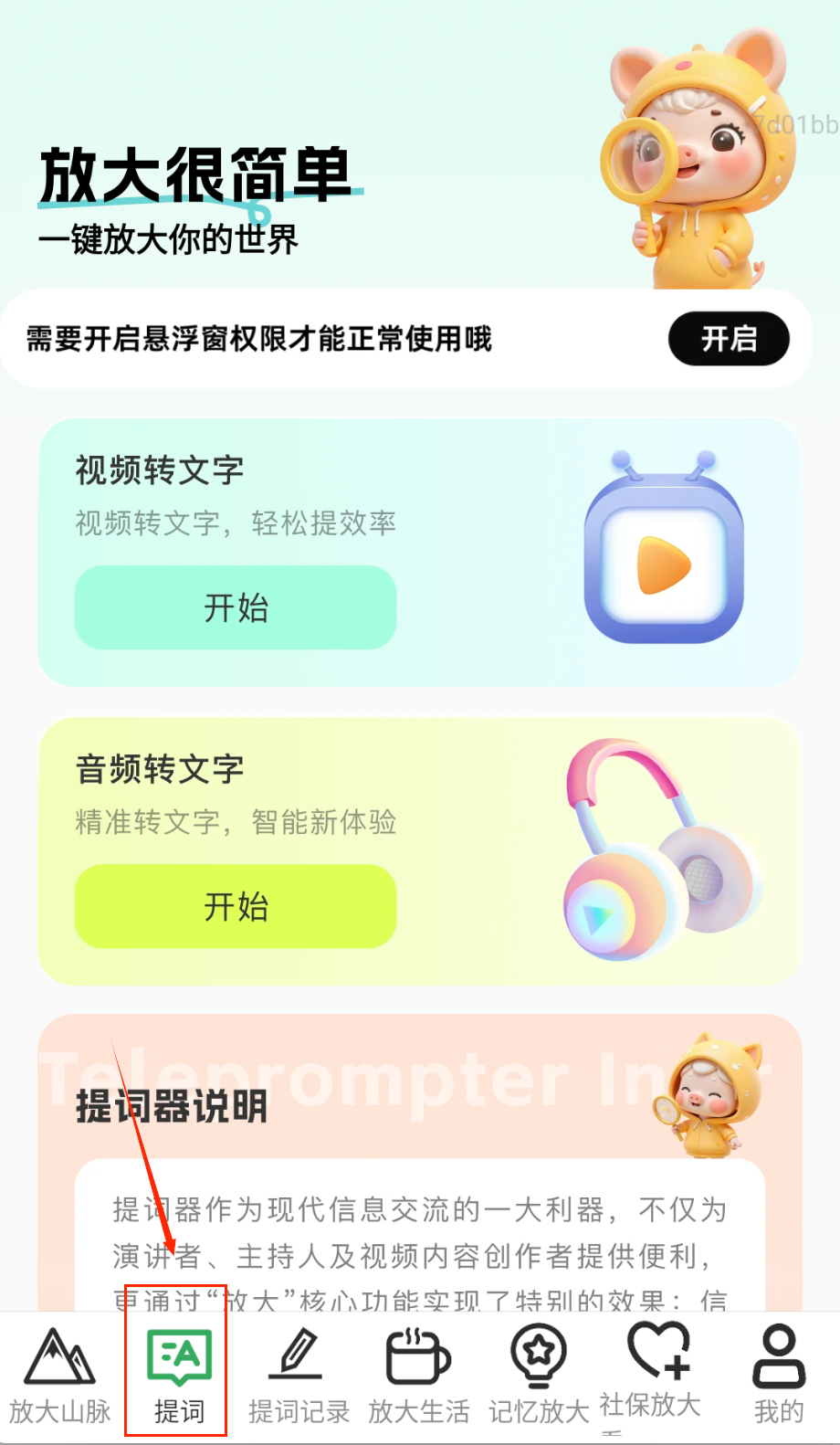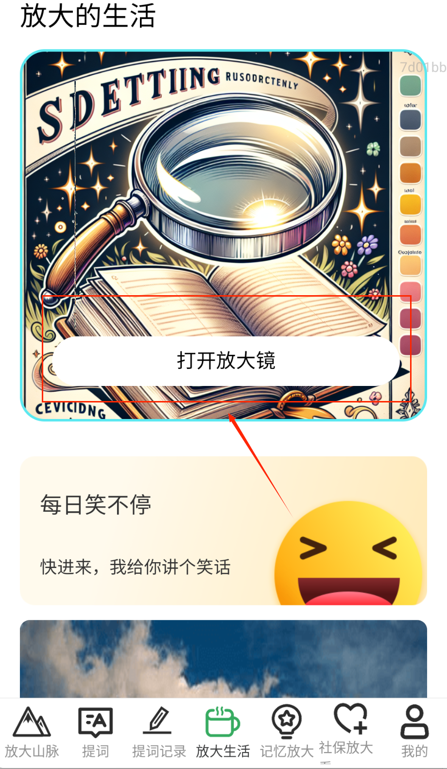 1、打开APP选择放大镜功能,对准文字或物体自动调节放大倍数,最高支持10倍无损放大哦。
