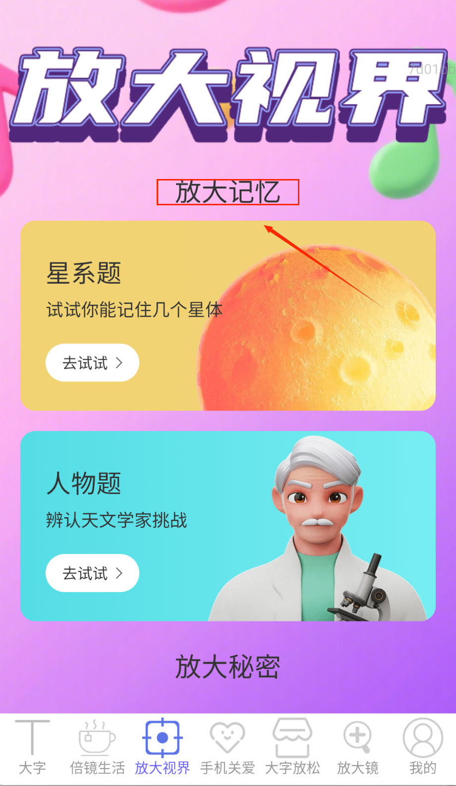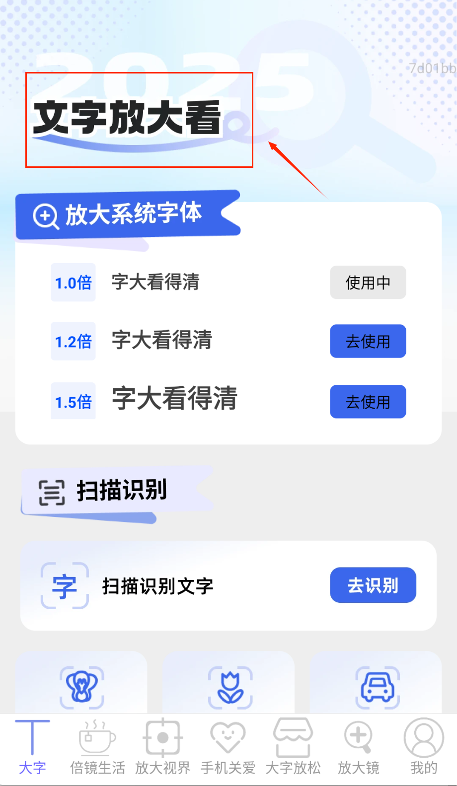 1、打开APP点击放大镜图标,对准文字或图片自动调节放大倍数,支持10倍无损放大哦。