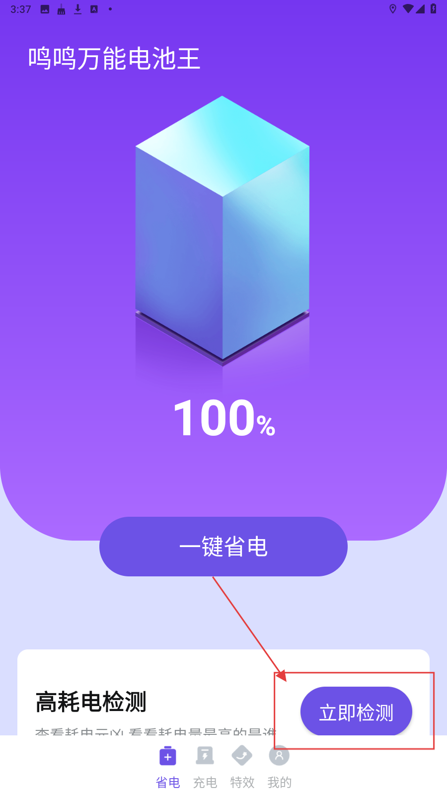 2、在耗电检测页面,点击【立即检测】按钮,进行耗电检测,关闭高耗电应用。