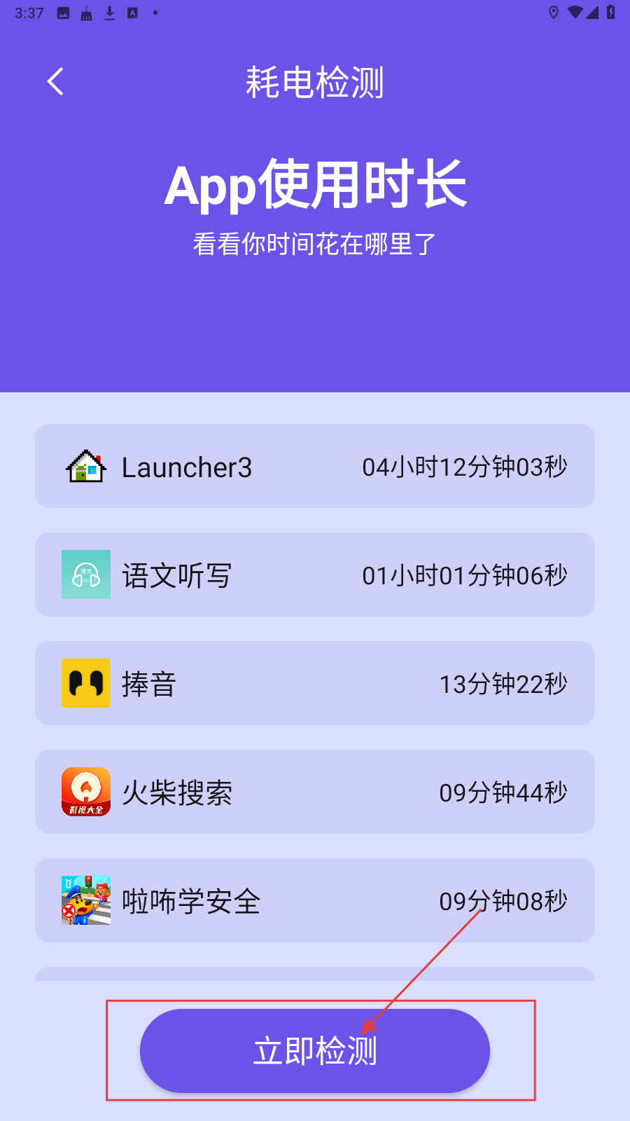 1、在首页点击【立即检测】按钮,进入耗电检测页面,查看App使用时长。