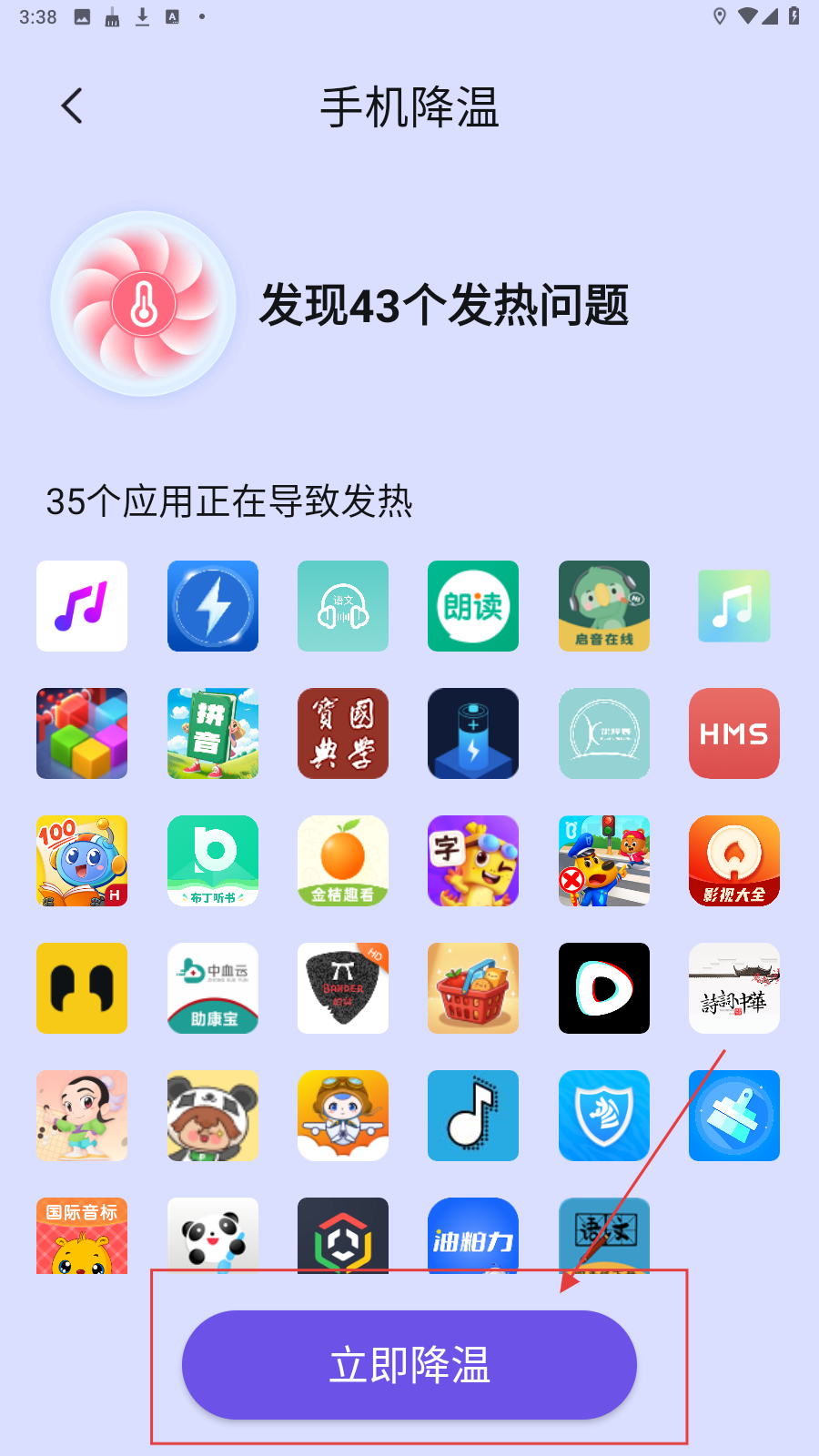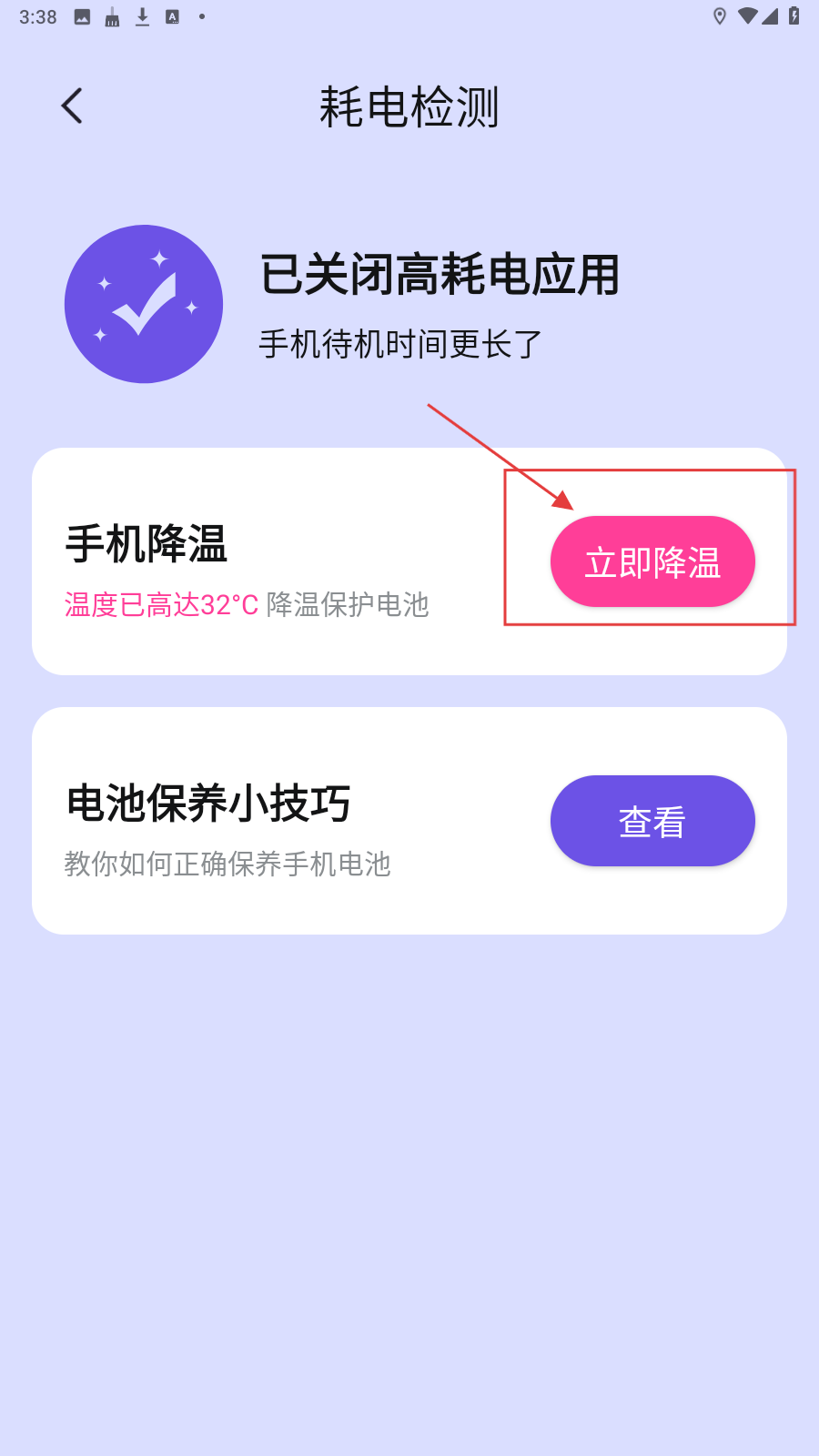 3、在检测结果页面,点击【立即降温】按钮,进入手机降温页面,查看发热问题。