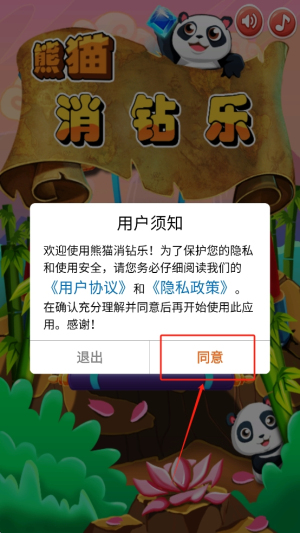 1、点击“同意”按钮,同意用户须知并继续游戏。
