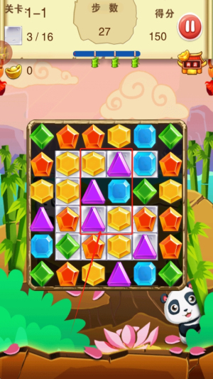 1、操控大熊猫进入关卡,观察钻石分布,点击交换相邻钻石,达成三个及以上同色相连即可消除,初步掌握三消基本操作,熟悉玩法。
