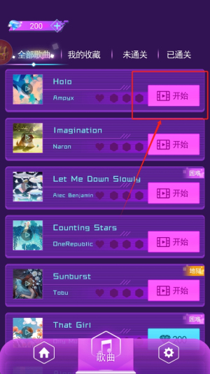 2、在歌曲选择界面,点击任意一首歌曲旁边的“开始”按钮,选择该歌曲并开始游戏。