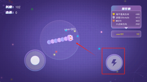4、使用加速:点击右下角的闪电按钮,使用加速功能,快速移动并尝试吃掉其他玩家的蛇蛇。