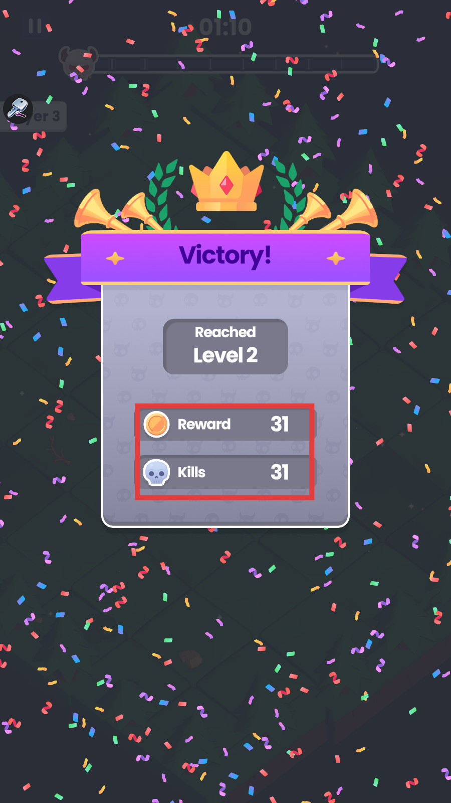 4、通关后显示击杀数量和获取金币数,点击屏幕进入下一大关卡。
