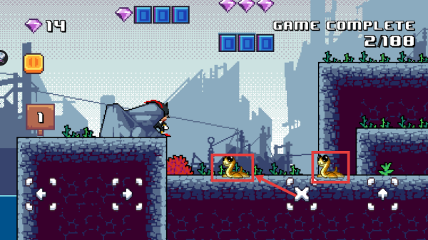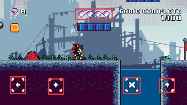 2、关卡中收集紫色钻石,利用界面下方按键控制角色跳跃,跨越沟壑等障碍。