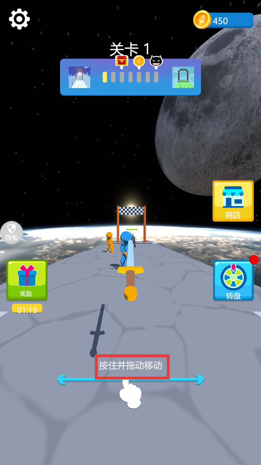 1、进入【关卡1】,按照提示【按住并拖动移动】,熟悉角色操控方式。