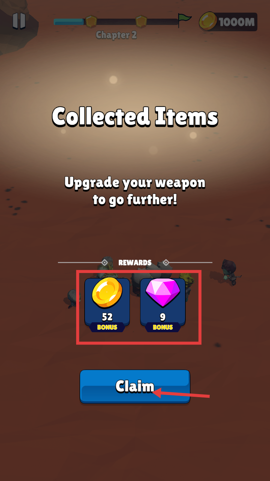 4、战斗结束,点击【Claim】领取金币、钻石奖励,用于武器升级,推进后续关卡。
