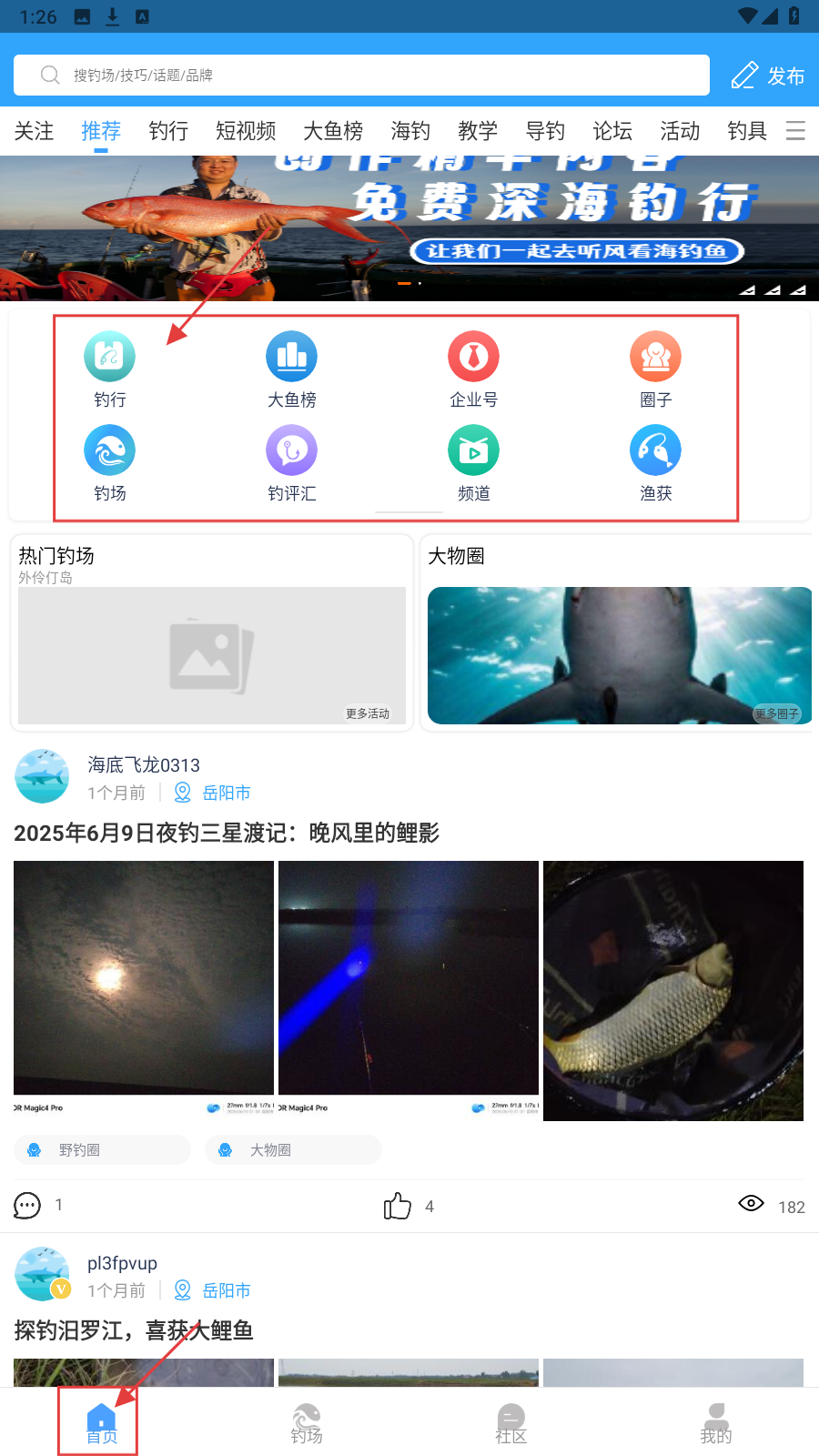 1、在APP首页,可通过【钓行】【钓场】等功能入口,快速进入对应板块,开启钓鱼相关操作。