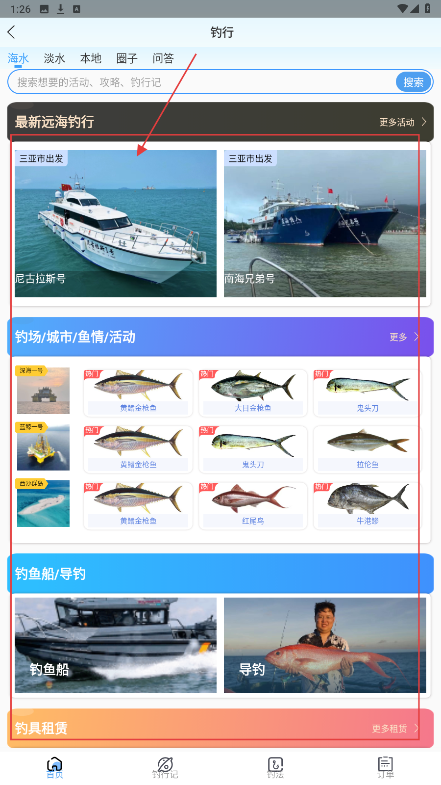 2、进入【钓行】页面,能查看最新远海钓行船只、各类鱼情及钓鱼船导钓等信息,方便选择合适钓行。