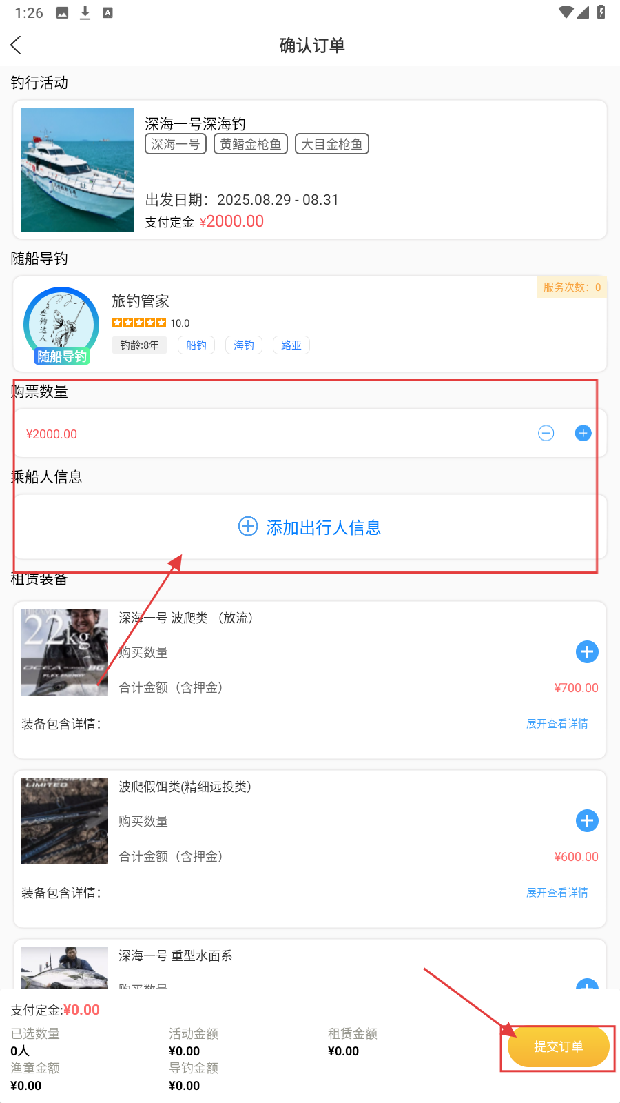 4、在确认订单页面,填写购票数量、乘船人信息,选择租赁装备后,点击【提交订单】完成操作。