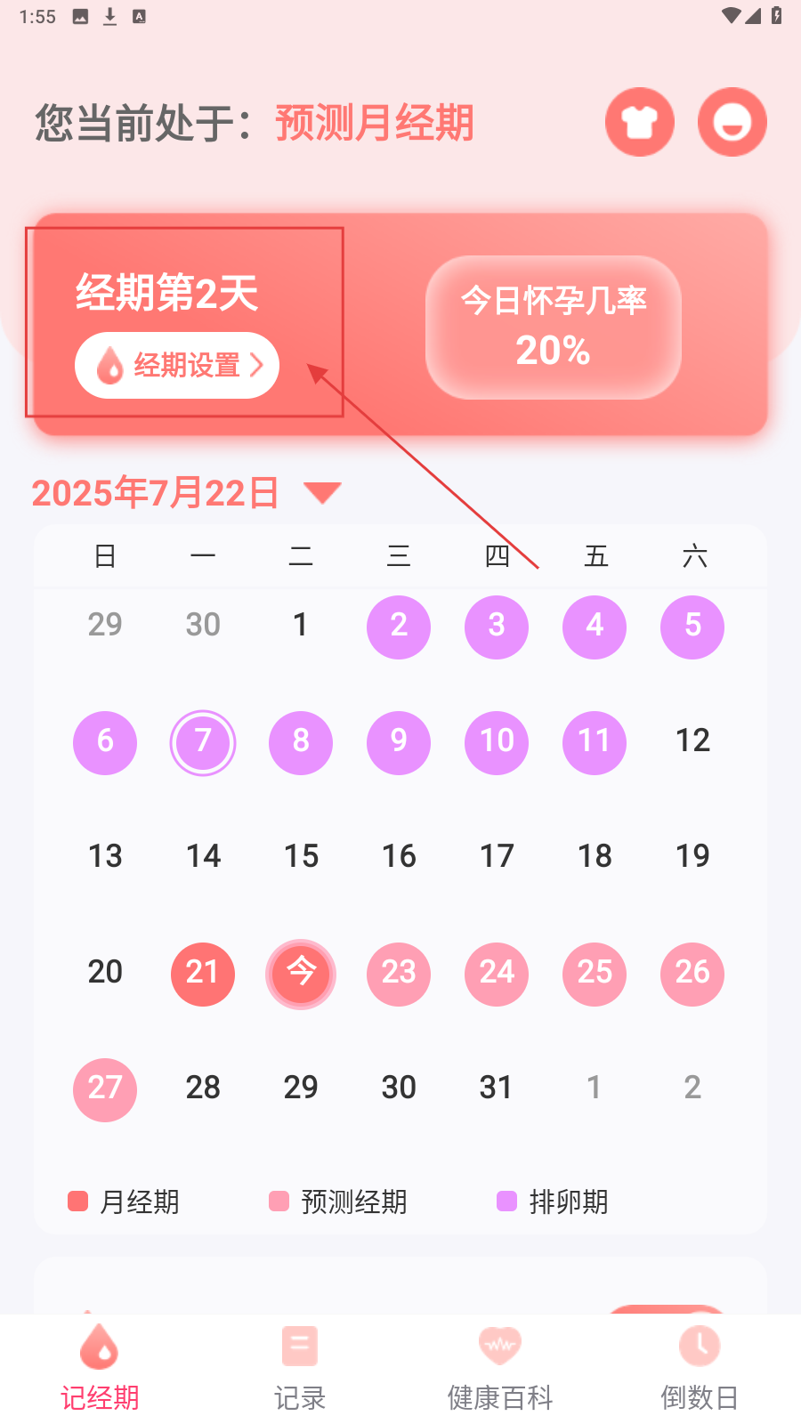 1、进入APP,可查看当前经期状态及今日怀孕几率,日历清晰标注不同生理时期。