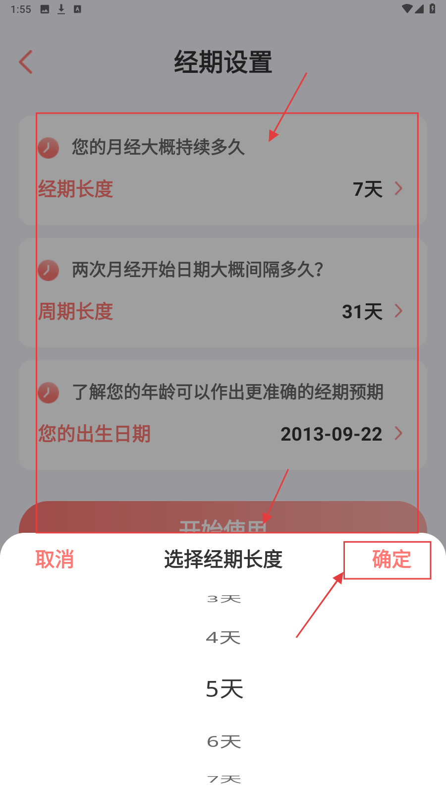 2、点击【经期设置】,按需设置经期长度、周期长度和出生日期,完成后点击【确定】。