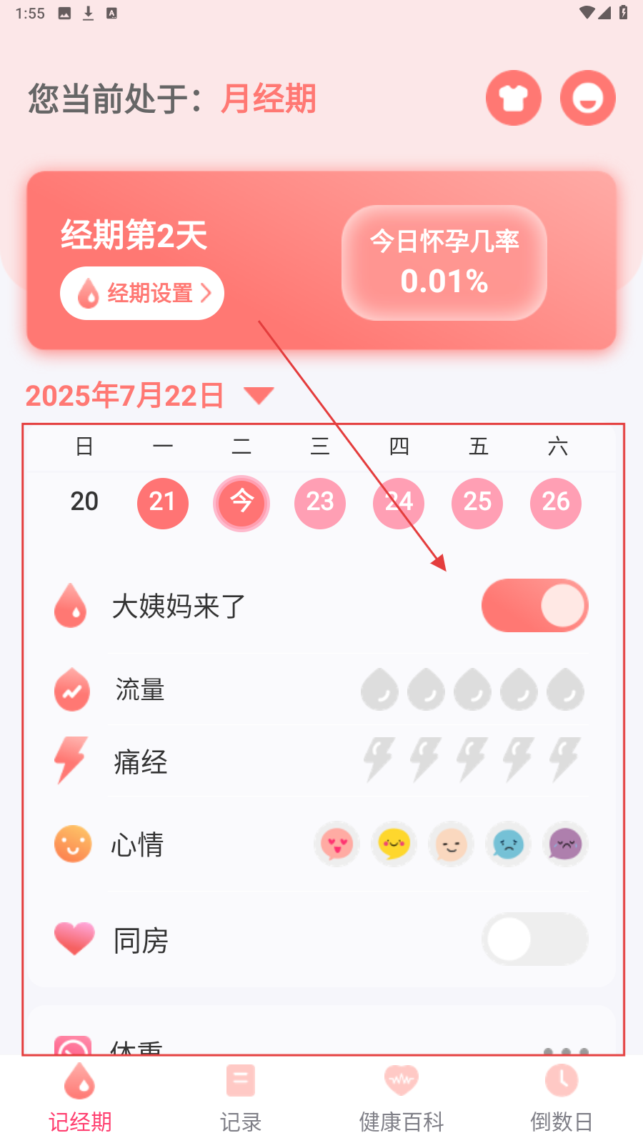 3、在经期记录界面,可记录“大姨妈来了”“流量”“痛经”“心情”“同房”等信息。