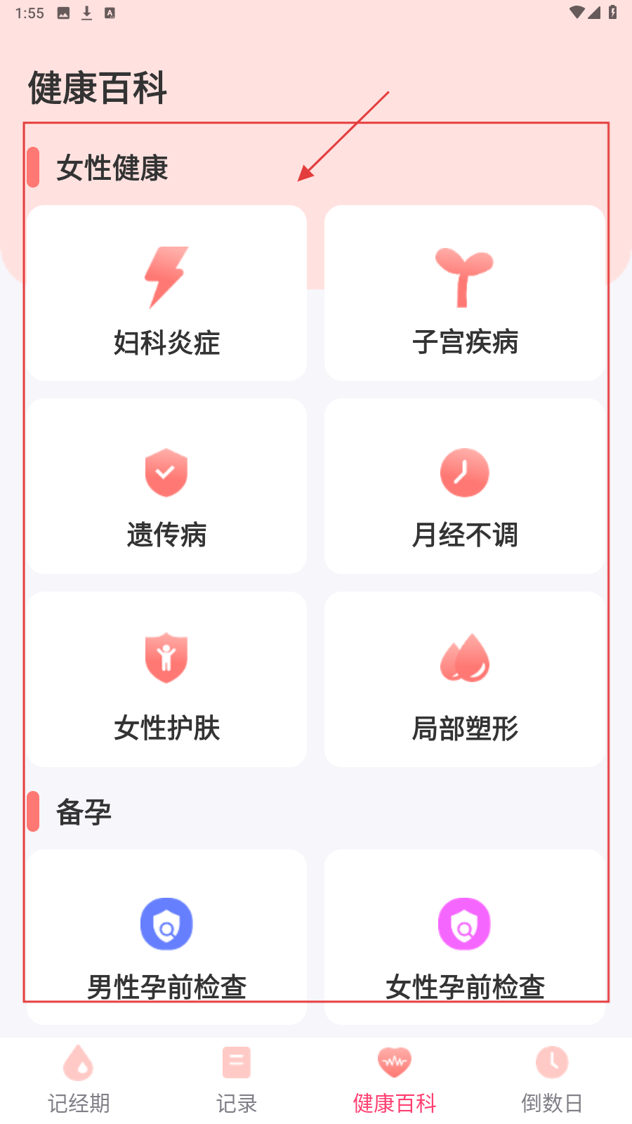 4、进入【健康百科】,可了解女性健康和备孕相关知识,如妇科炎症、孕前检查等。