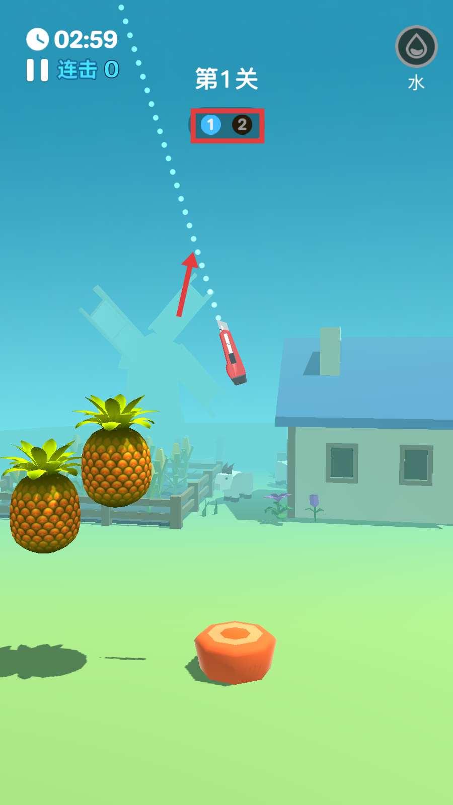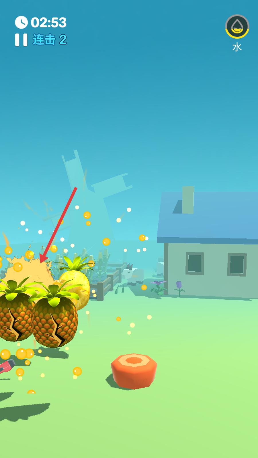 3、在小刀瞄准到菠萝的时候,再次点击屏幕,小刀会在空中突刺,切开水果,获取分数和奖励。