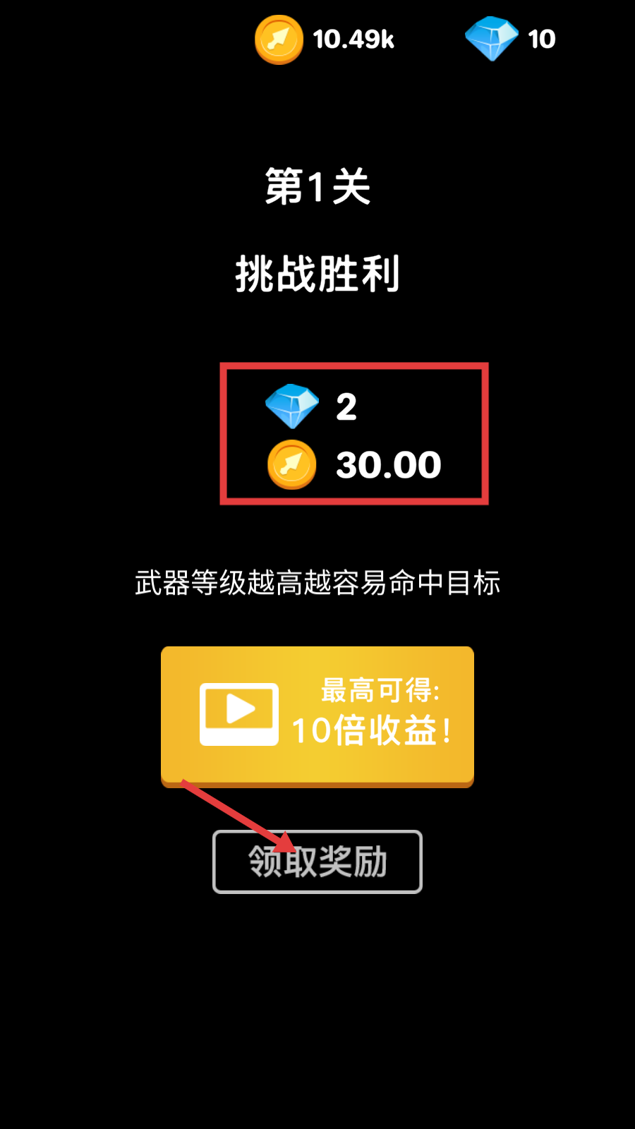 4、挑战胜利后,点击【领取奖励】,获取【2-钻石】与【30.00-金币】,用于提升武器。