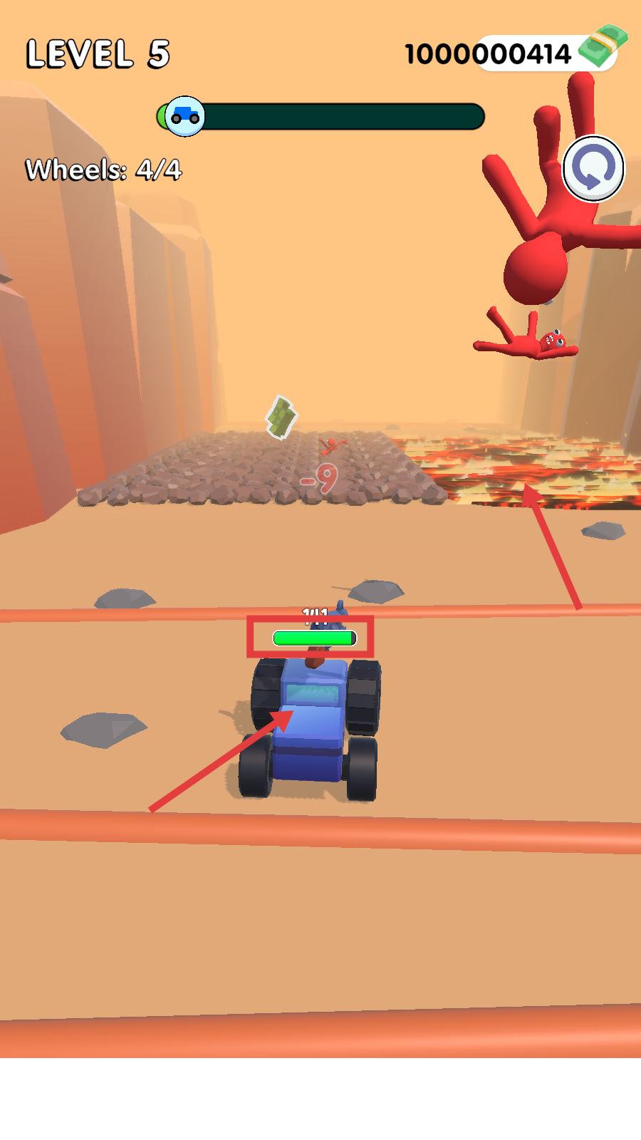 2、行驶中关注车辆上方绿条血量,滑动屏幕操纵汽车,避开火焰区域,利用武器攻击红色敌人。