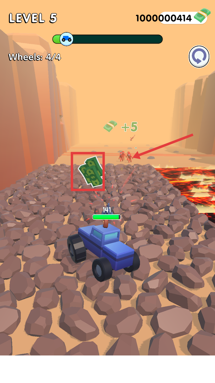 3、在碎石路段收集绿色钞票,靠近红色敌人时精准射击,积累资源。