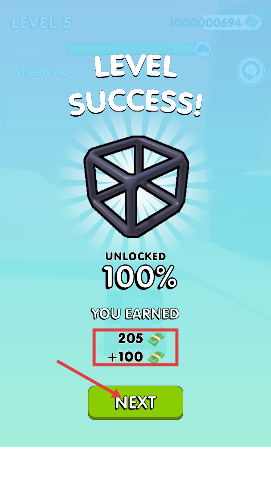 4、成功通关后,点击【NEXT】,领取【205-钞票】与【+100-钞票】奖励,进入下一关。