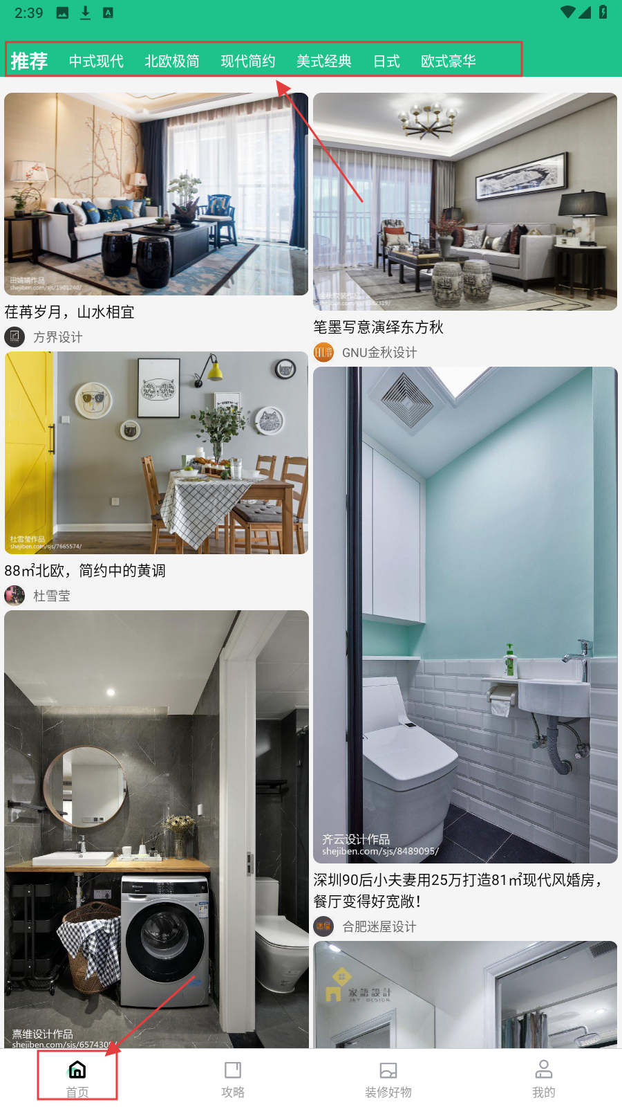 1、进入APP首页,可浏览【推荐】、【中式现代】等多种装修风格分类,挑选心仪的装修案例参考。