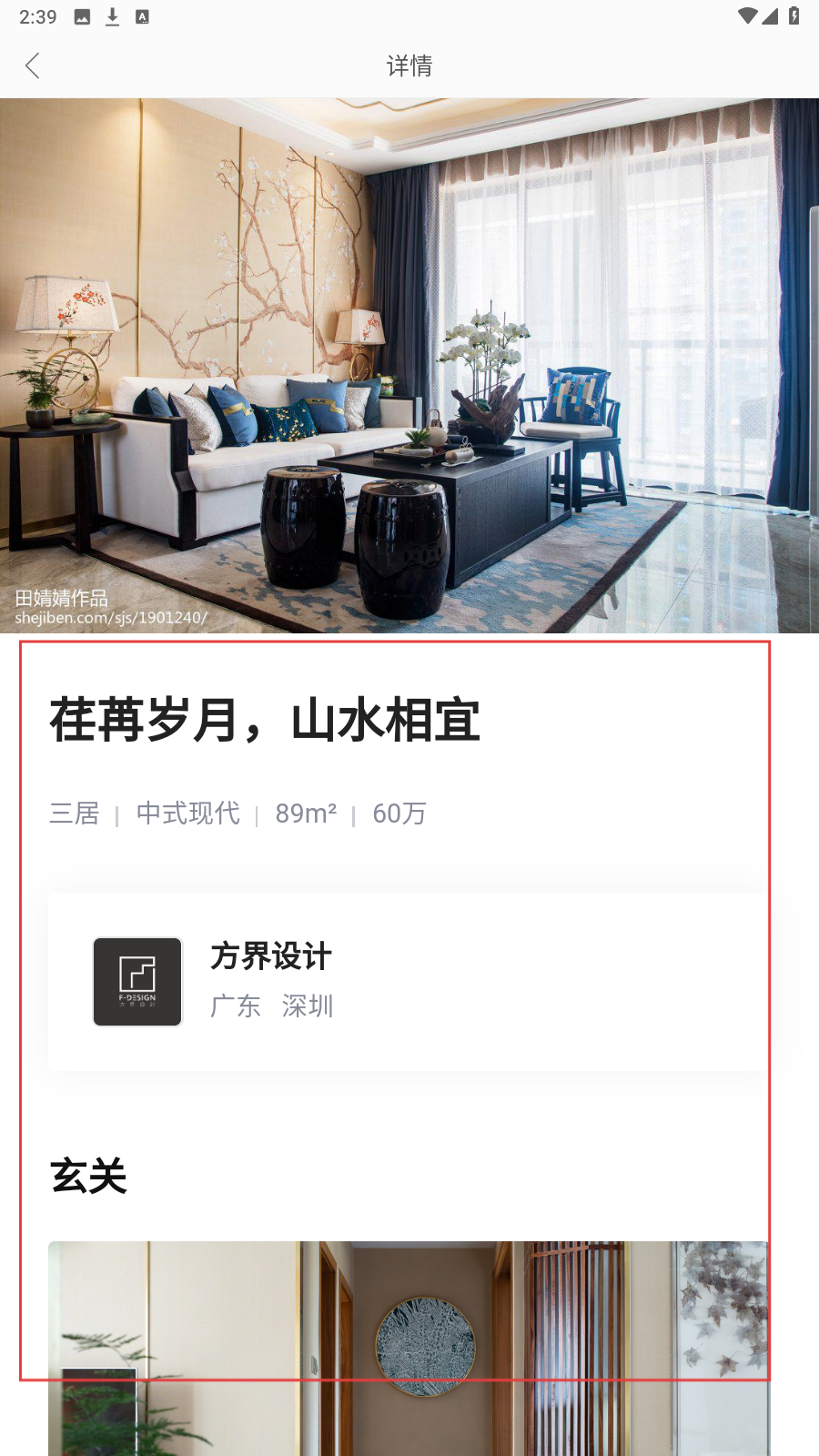 2、点击感兴趣的装修案例,如【荏苒岁月,山水相宜】,查看案例的户型、风格、面积、预算及设计公司等详细信息。
