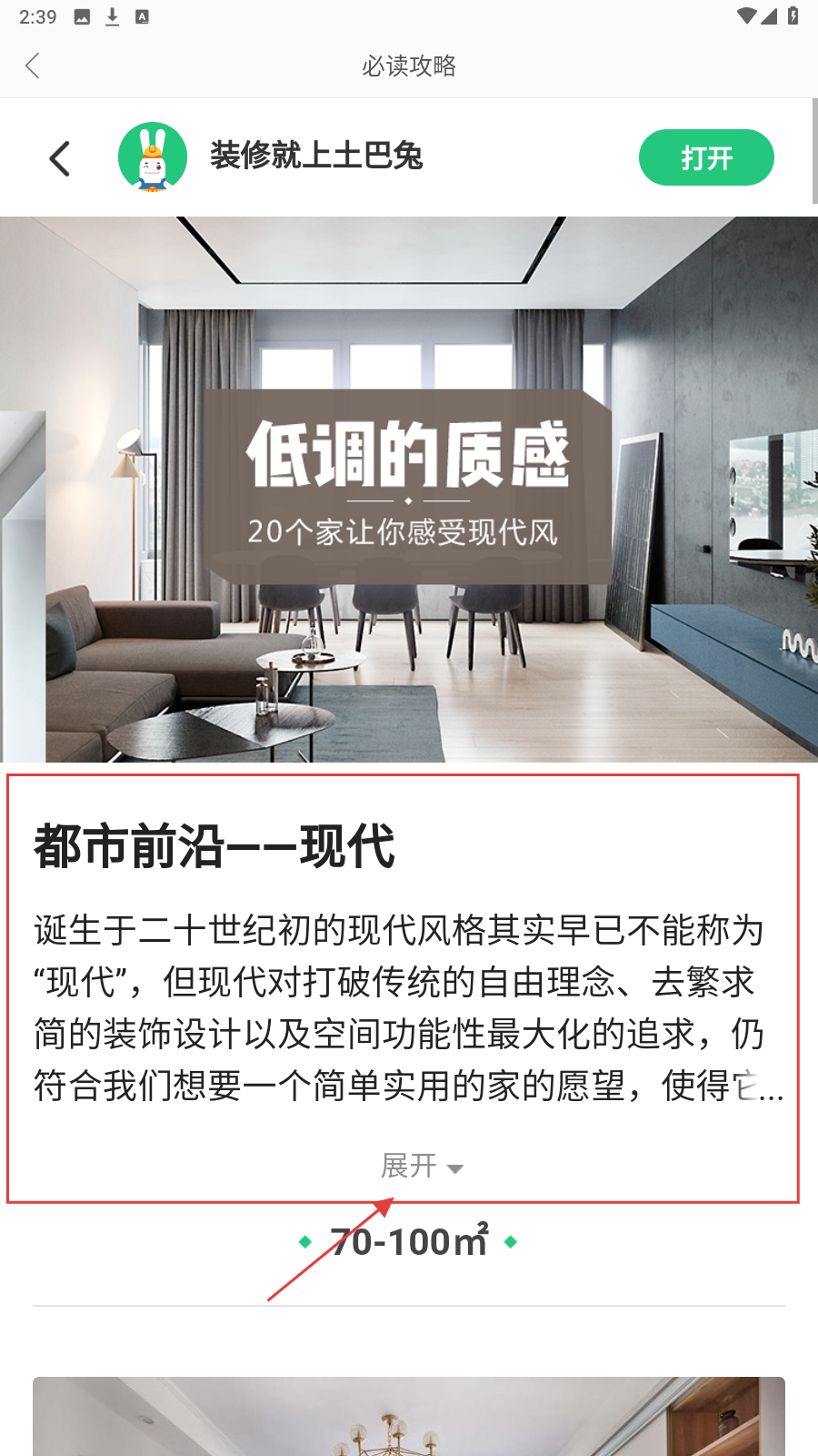 4、进入【必读攻略】页面,查看现代风格装修介绍,点击【展开】获取更多关于现代风装修的知识。