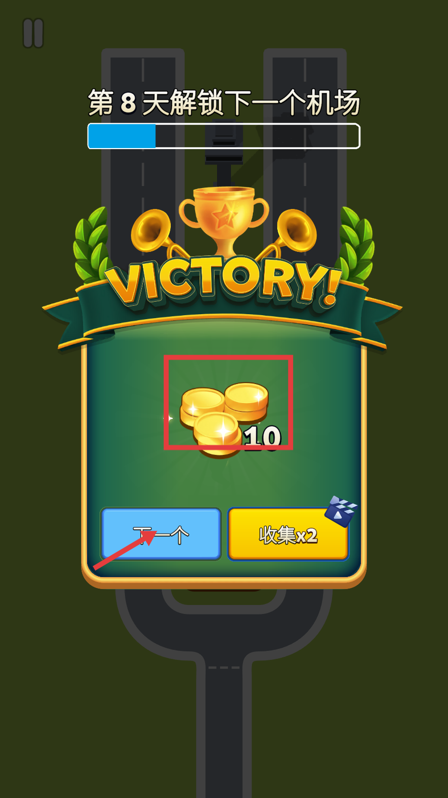 4、通关后领取10金币奖励,点击【下一个】,解锁后续机场关卡。