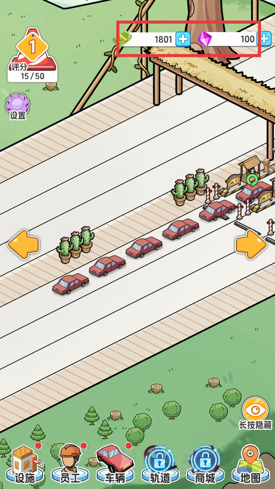 1、查看资源(1801金币、100紫晶),规划用于设施升级、员工招聘等。