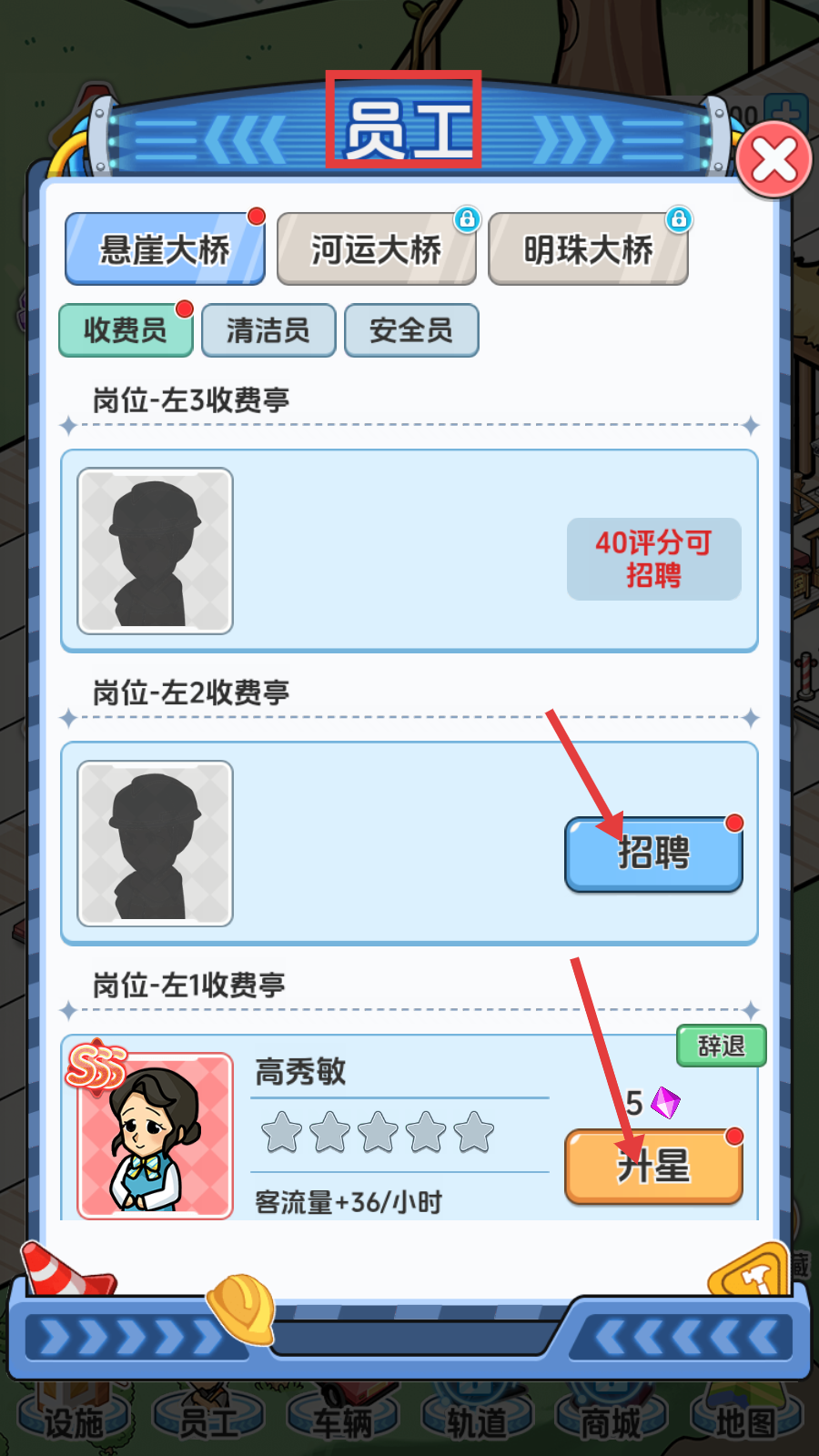3、打开【员工】,招聘左2收费亭员工,消耗5紫晶为“高秀敏”升星,增加客流量。