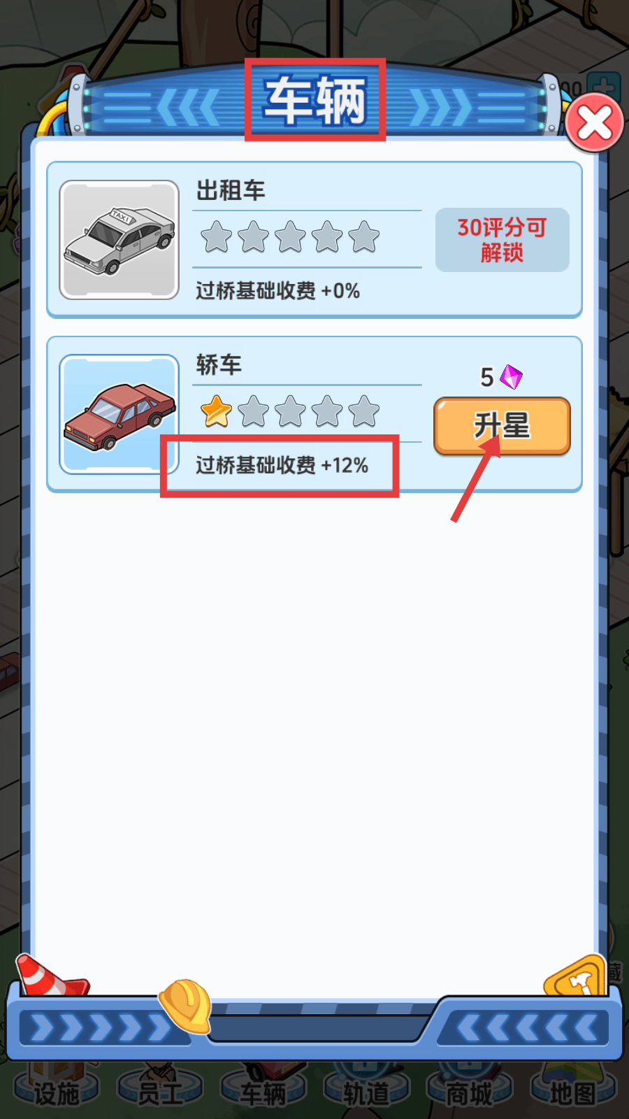 4、点击【车辆】,消耗5紫晶为“轿车”升星,提升过桥收费收益(+12%)。