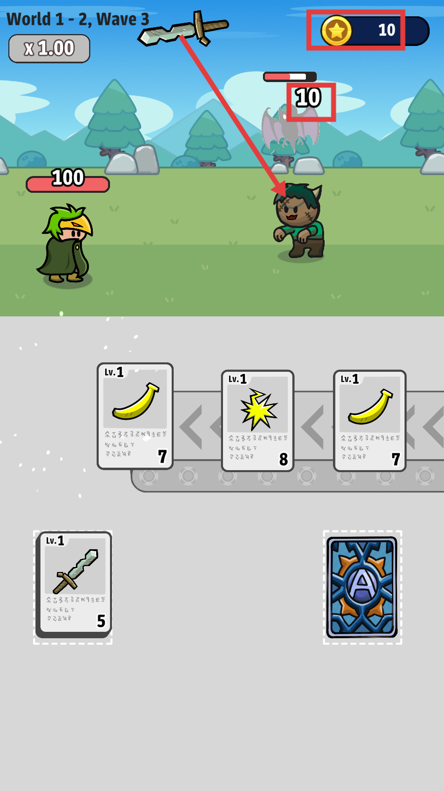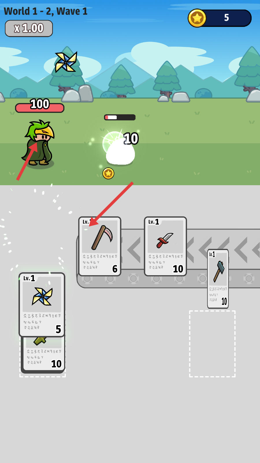 1、场景中的传送带将卡组的卡牌向左运送,角色会按照运送的卡牌顺序释放技能,攻击前行路上的敌人。