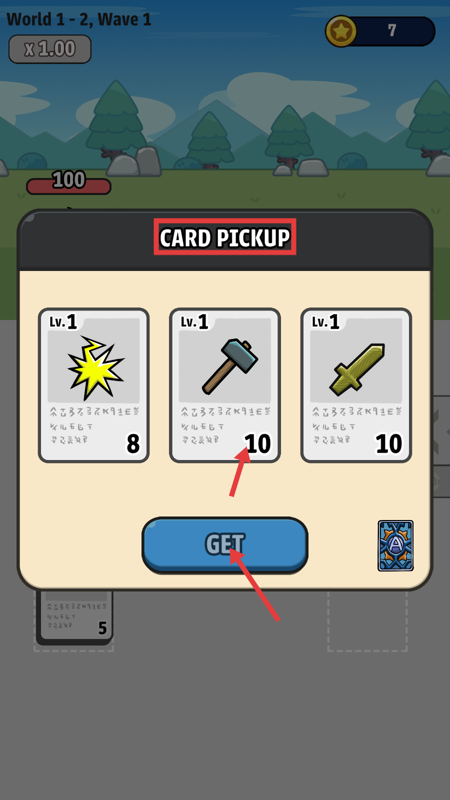 2、在卡牌挑选界面,优先选【锤子】卡牌,其威力在一级卡牌中也是最高的,点击【GET】获取,添入卡组中。