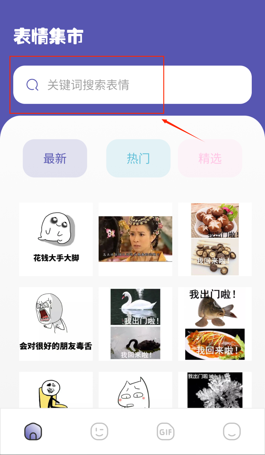 1、打开应用进入表情集市,通过分类标签或搜索框快速定位目标表情,长按预览后点击发送按钮直接分享至聊天窗口。