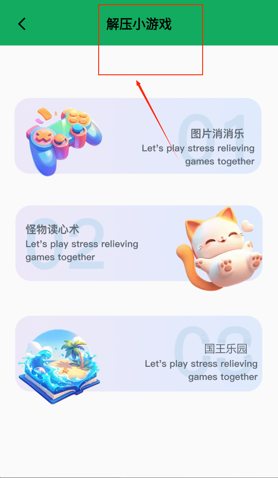 2、解压游戏中心体验趣味小游戏,通过互动方式缓解压力,实时监测情绪变化啦。