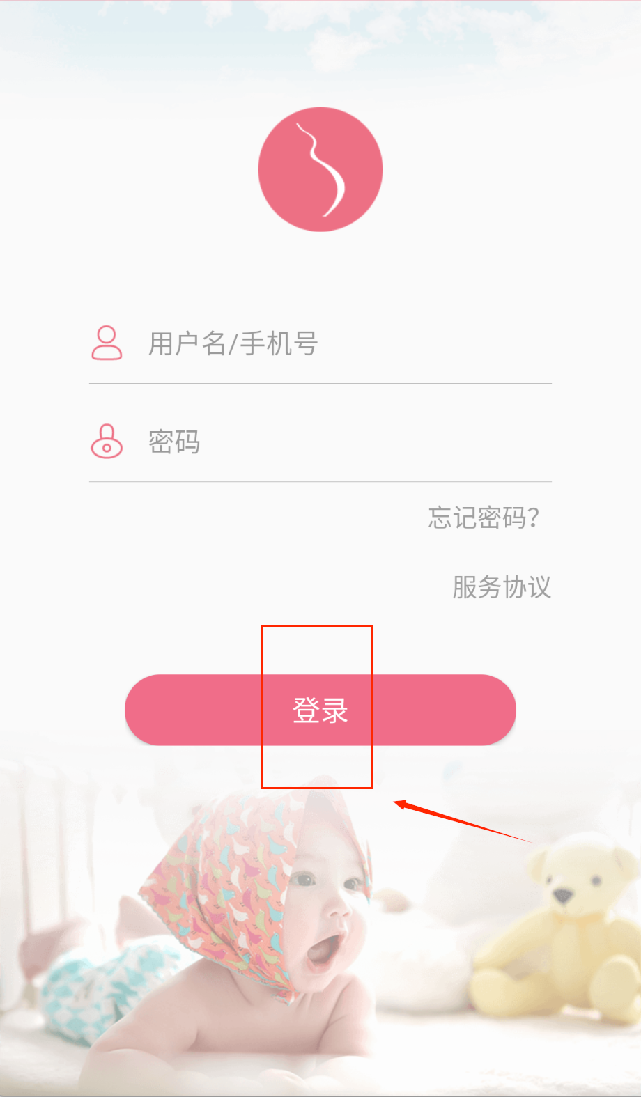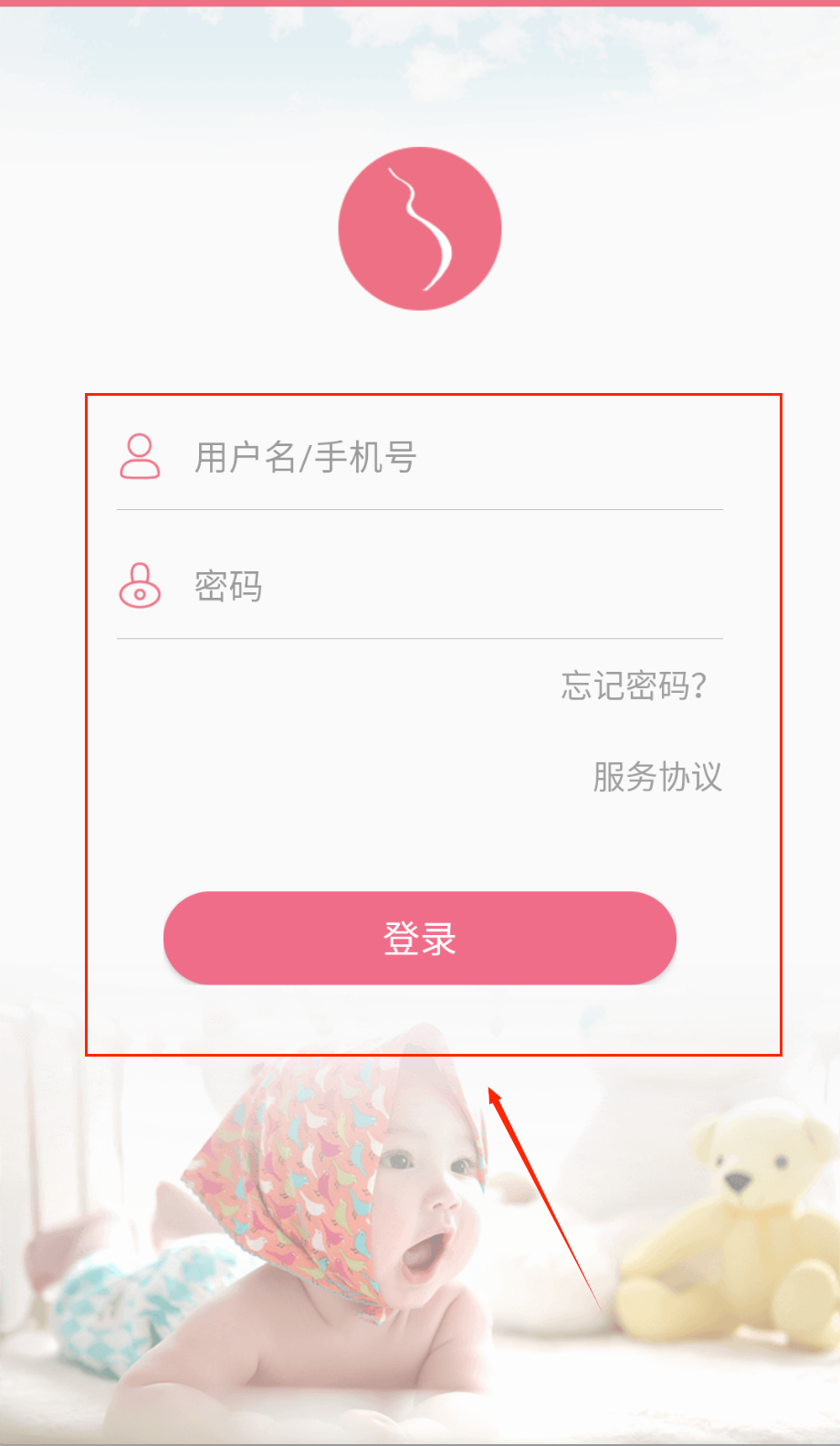 2、登录界面认准粉色主题风格,顶部有怀孕曲线图标,在两个带图标框里填手机号密码,记得输完检查下有没有错啦。