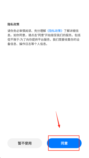 2、首次进入时仔细阅读隐私政策,确认无误后点击“同意”继续。