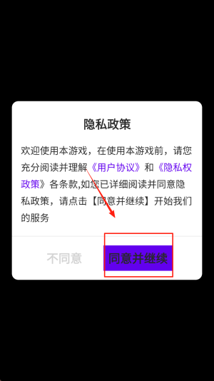 1、阅读隐私政策后点击“同意并继续”即可进入游戏。
