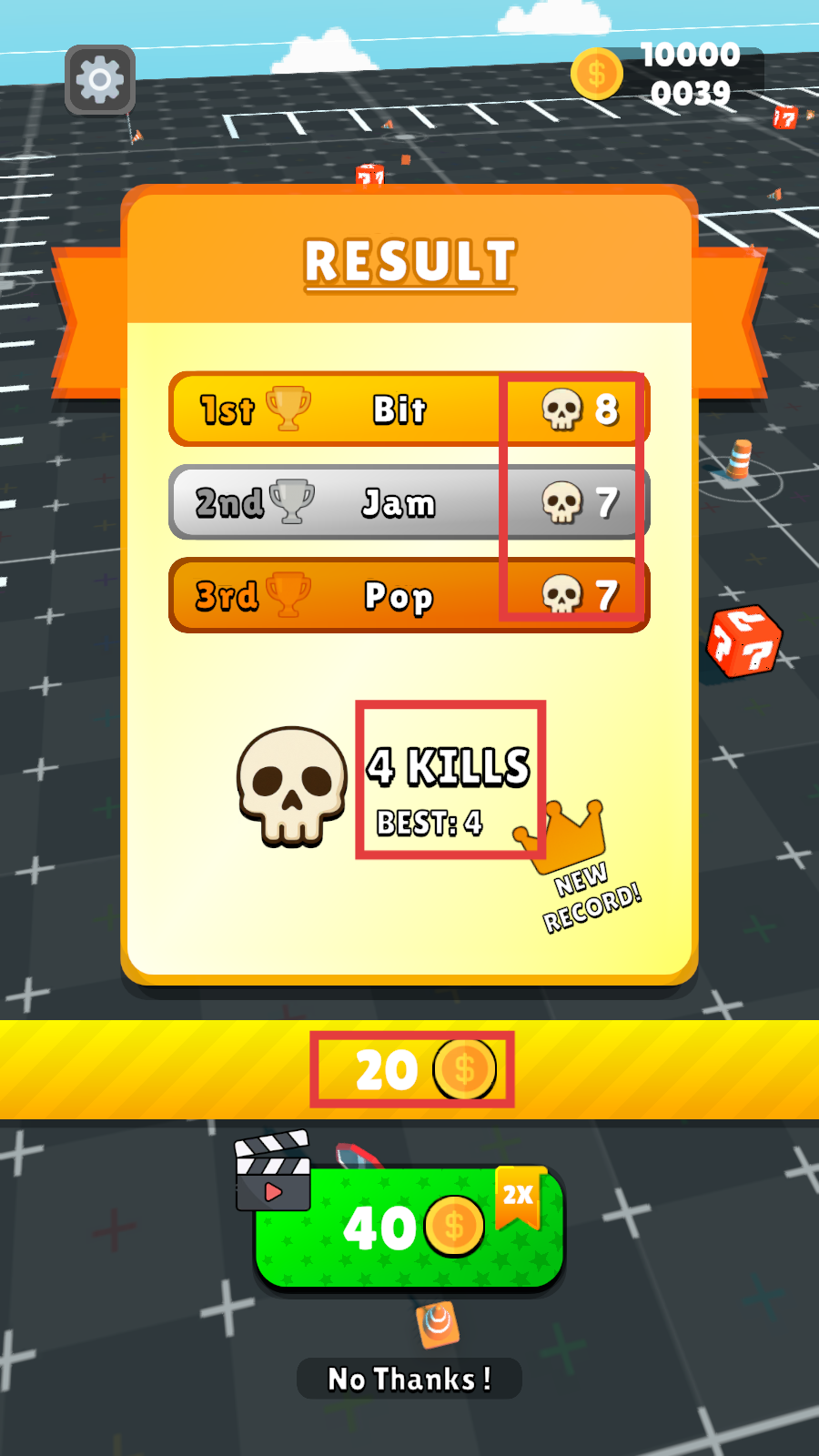 4、结算看【4-KILLS】等数据,领取20金币,后续可进【SHOP】升级车辆再战。
