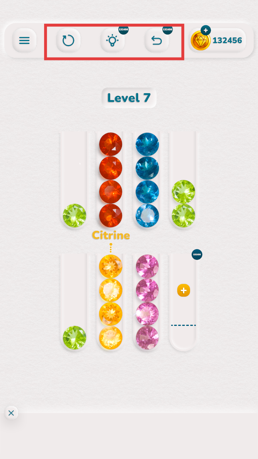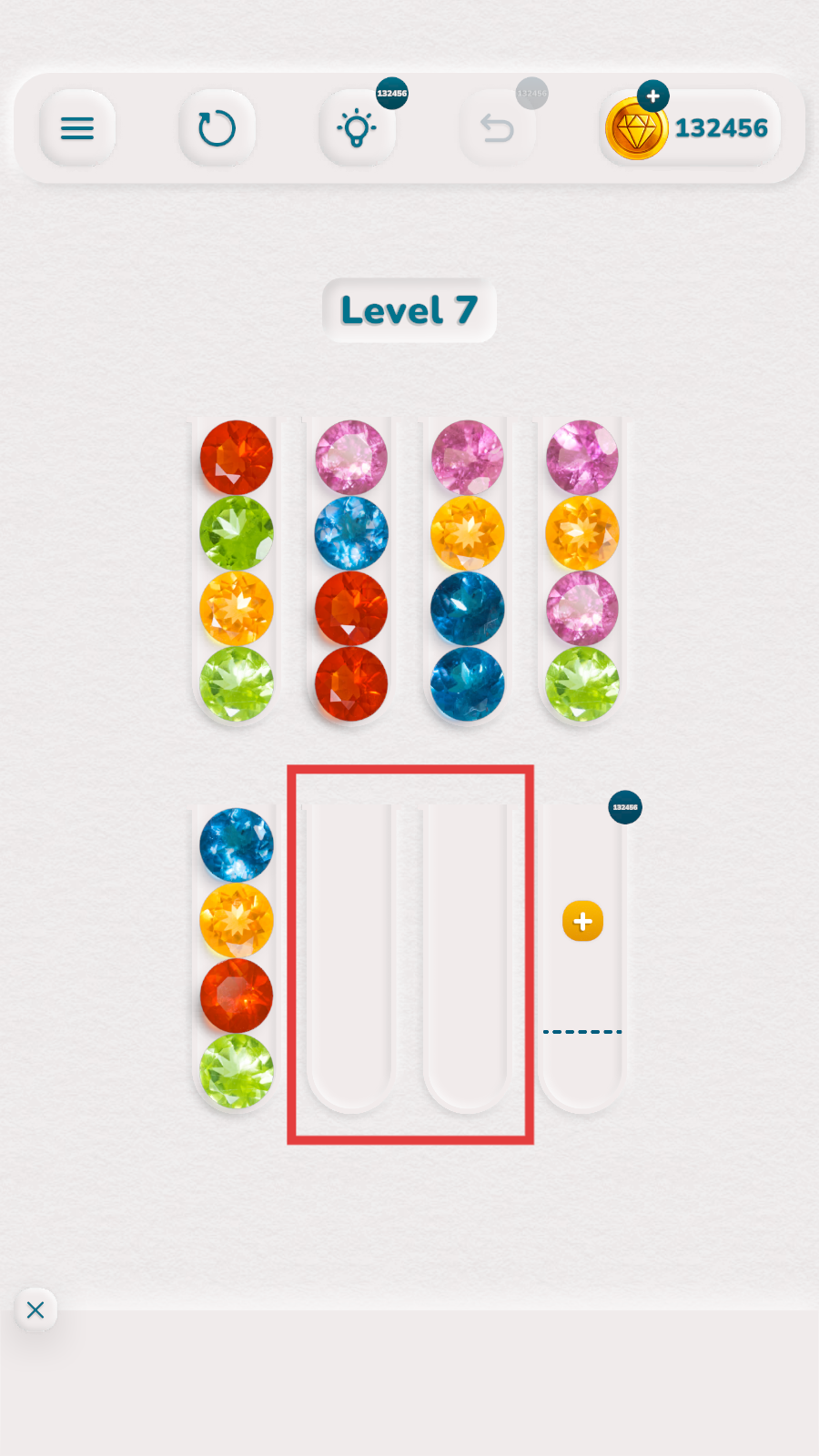 1、观察宝石颜色,利用空试管分类,优先整理同色宝石。