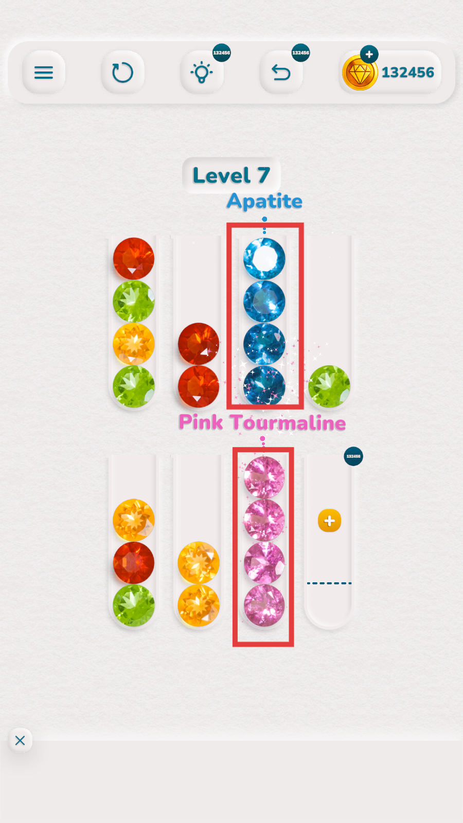 2、依据提示【Apatite】等分类,移动宝石到对应试管,4个宝石填满一个试管,注意顺序。
