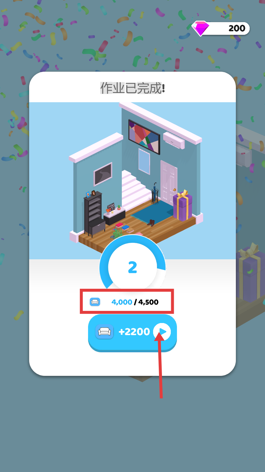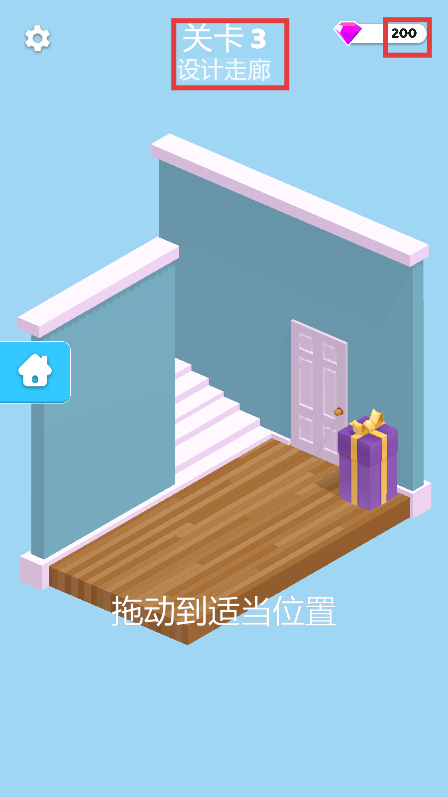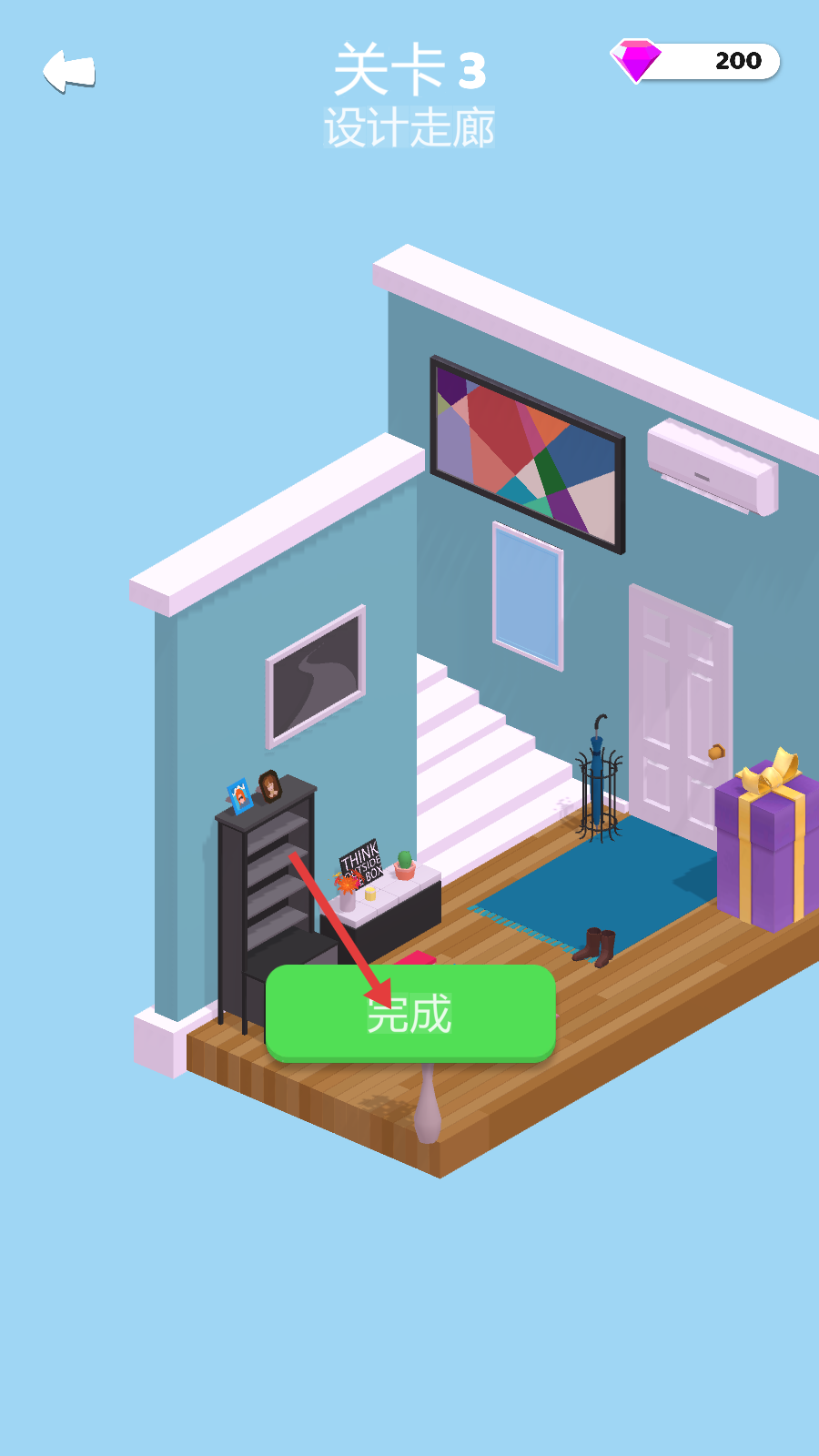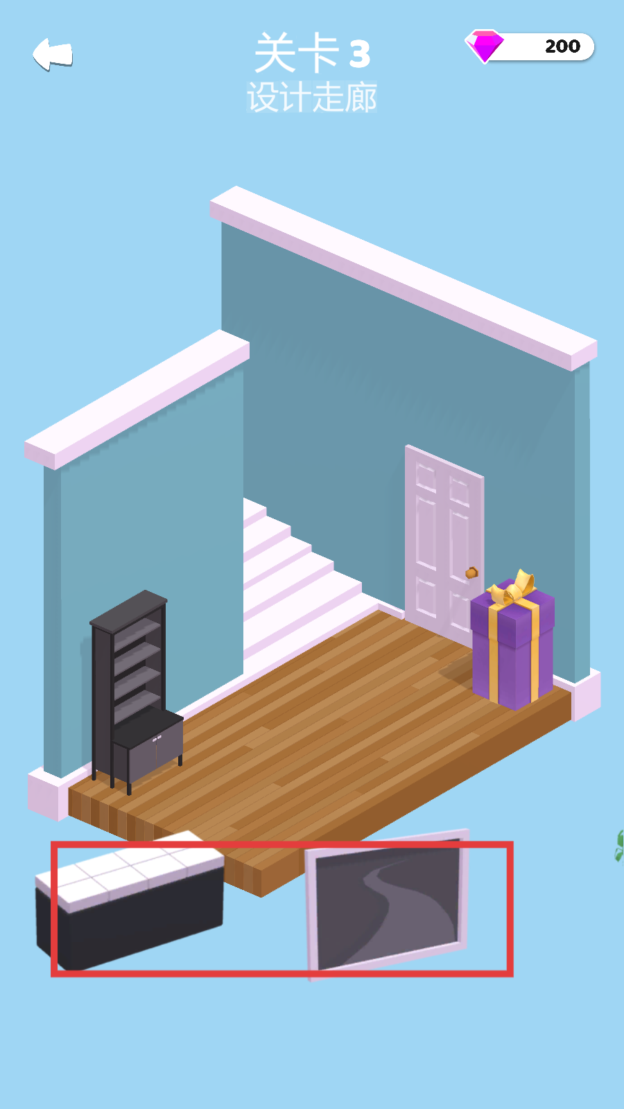 1、进入【关卡-3】,查看钻石200,准备拖动家具布置走廊。