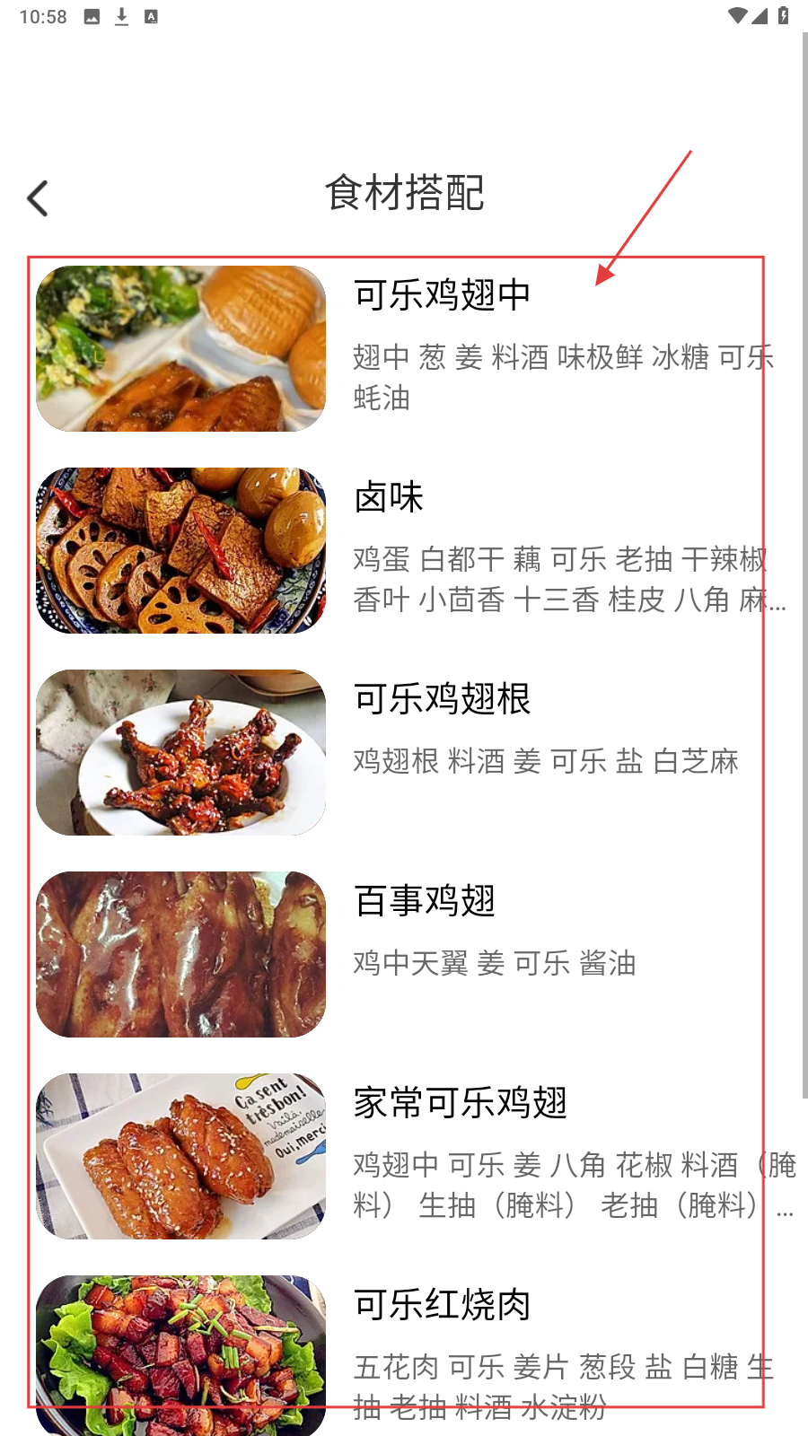 3、进入【食材搭配】页面,查看两种食材所搭配可以制作的菜品,选择想制作的菜品并点击。