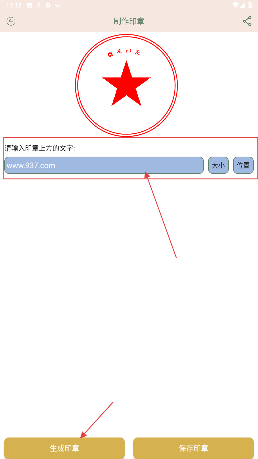 2、进入【制作印章】页面,在输入栏中输入印章上方的文字。输入完成后点击【生成印章】。